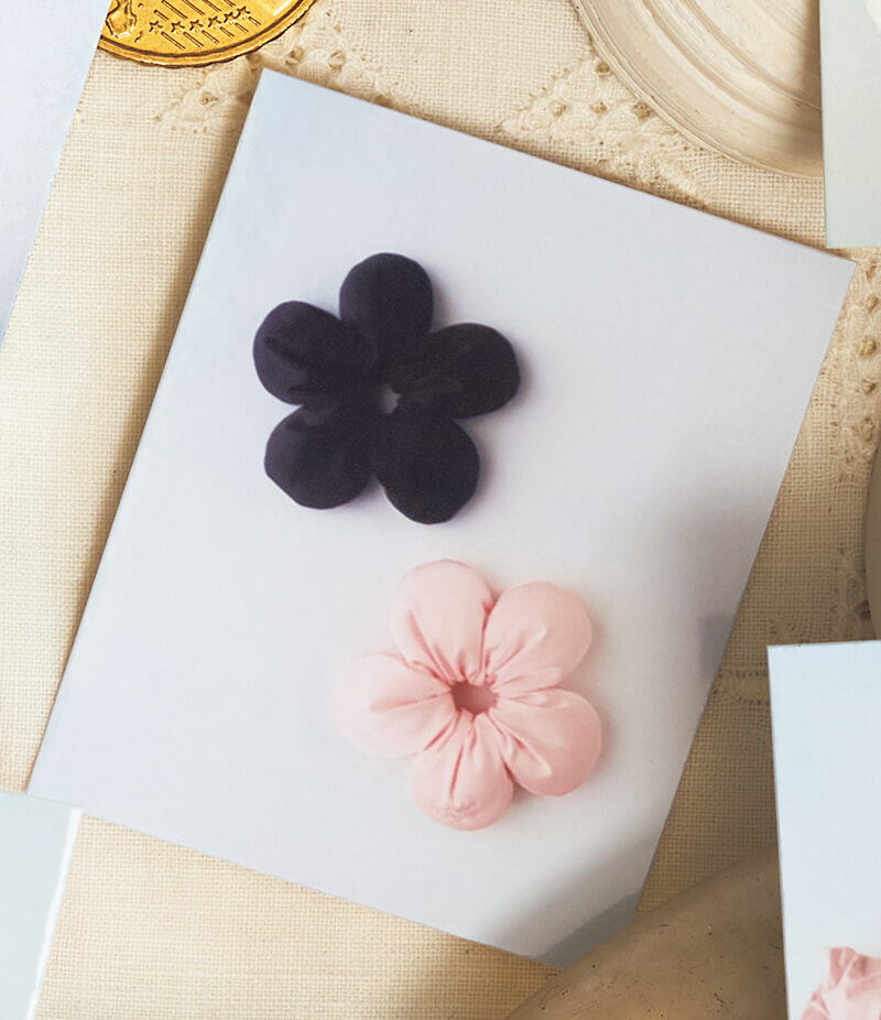 束ねるだけで一気にヘアにプレイフルなアクセントをもたらすパッド入りサテンのビッグシュシュ各¥10,125/ともにサンディ リアング(リディア)