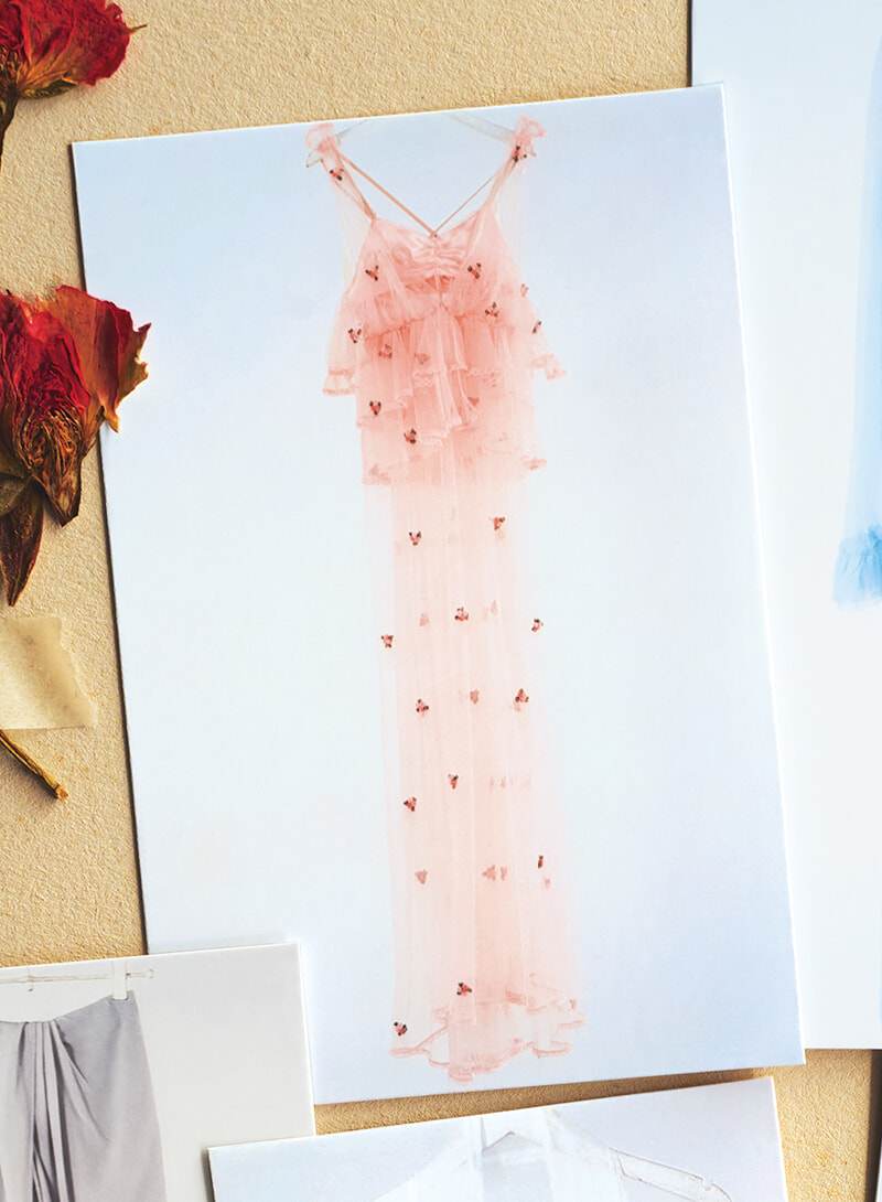ふわっと腕を飾るスリーブが施され一層フェミニンに。リボンでできたキッチュなローズをちりばめたロングドレス¥220,000/タナカ ダイスケ