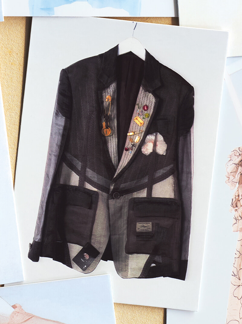 シックなブラウンのオーガンジー素材を重ね、さらに襟元にはポップなピンをアクセントにしたプレイフルなジャケット¥330,000/アンダーカバー