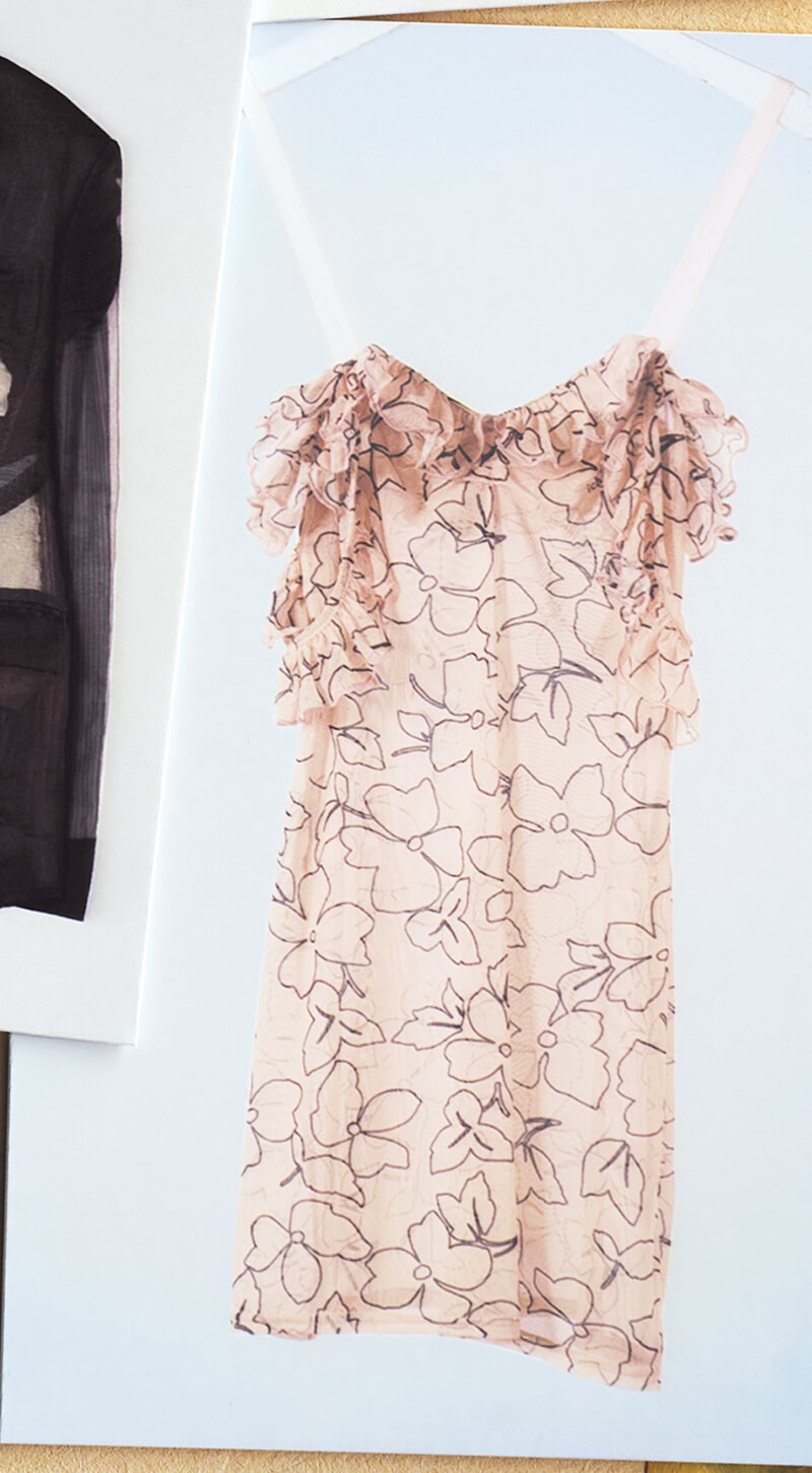 フリルトリムはまるで映画の主人公が纏うナイトウエアのよう。インナー付きのシルクドレス¥327,800/ヌメロ ヴェントゥーノ(イザ)