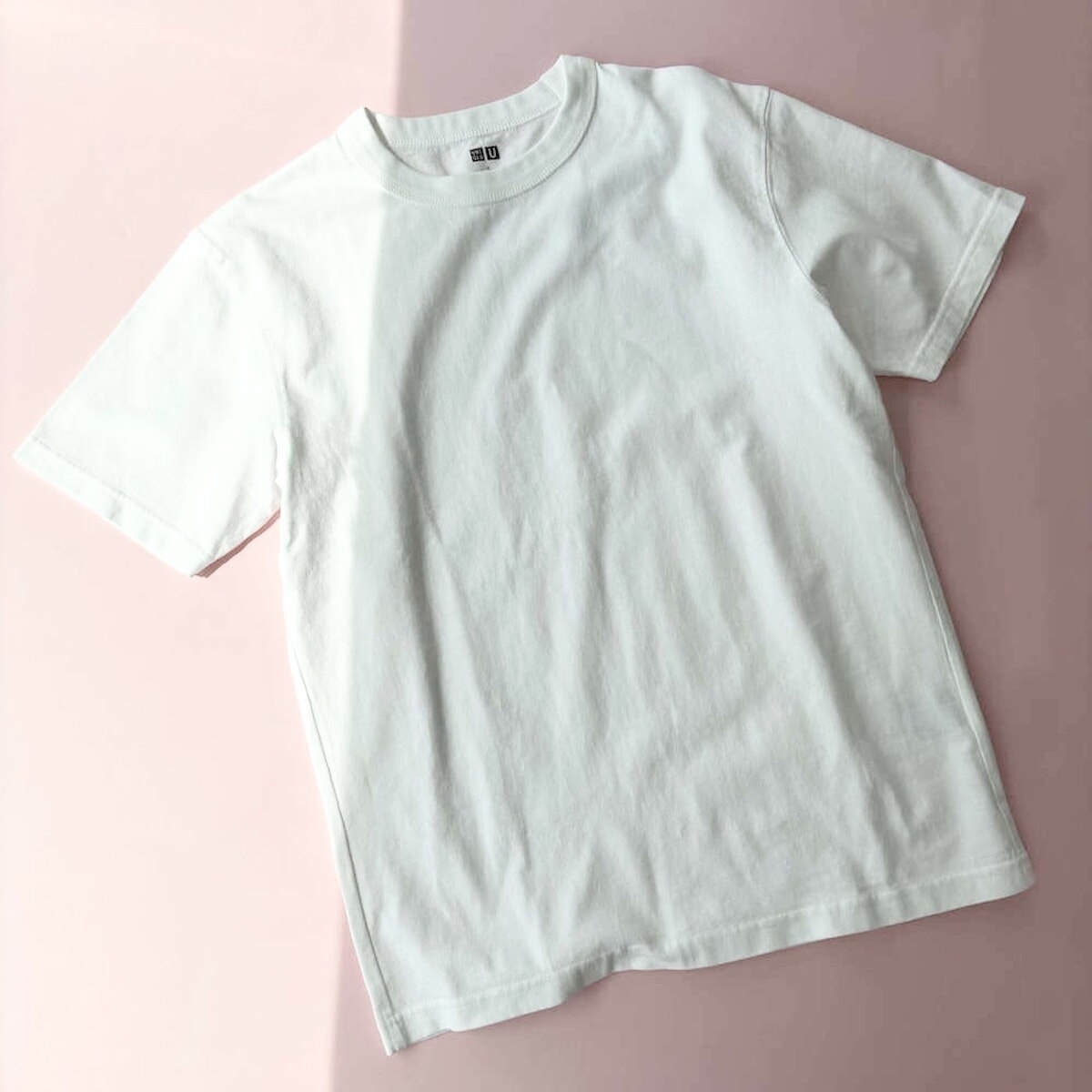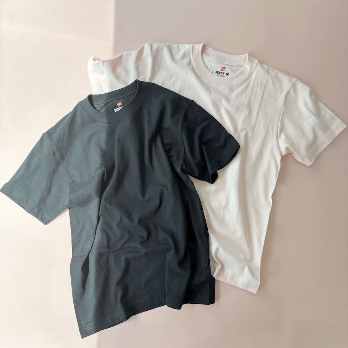 Tシャツ選びの基準は、ベーシックで無地、お財布に優しいこと。毎年、ヘインズ、コス、ユニクロは必ずチェックして、新しい1枚を手に入れています。こだわるポイントは、首回りのリブがしっかりあること、首元が詰まっていること、厚手の生地であること。Tシャツは無骨にメンズっぽく着たいので薄手の生地は選びません(きっぱり)。特にヘビーウェイトTの代名詞、ヘインズのビーフィーTシャツ(1枚約1,850円)は、丈夫で洗うほどこなれていく生地が好き。冬にはニットのインナーとして首元からチラッと覗かせたいので、リブの高さがあることも重要なんです。ずっと白か黒の無地Tで過ごしてきましたが、今年は淡いピンクが気分です!