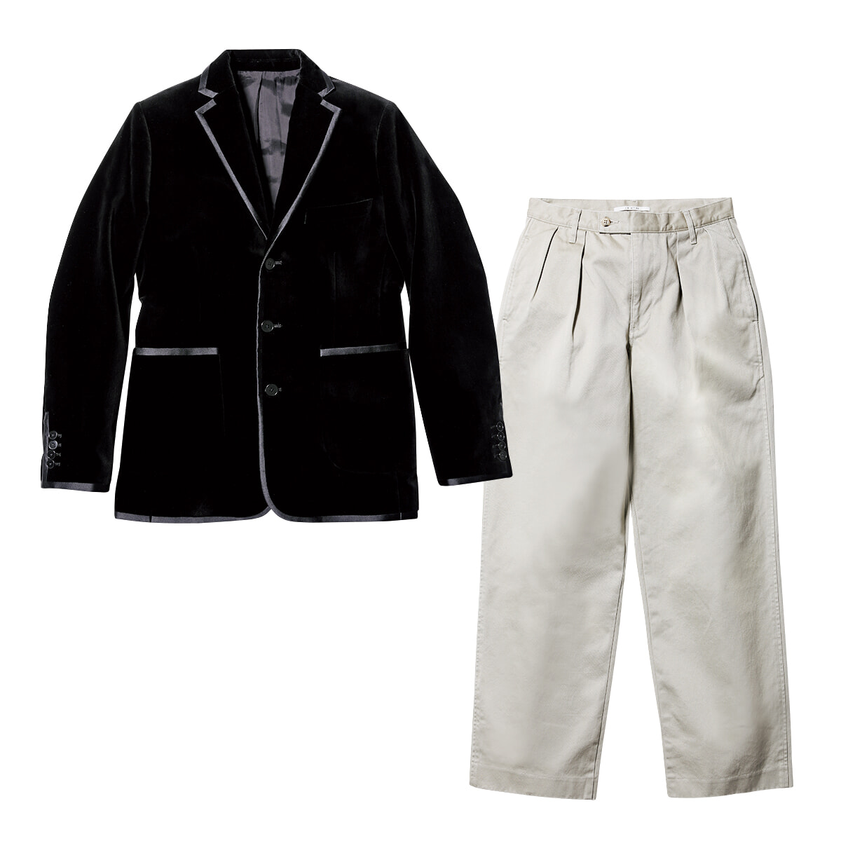 来シーズンにリリースされる、サテンテープでトリミングしたベルベットジャケット(価格未定)、チノクロスを使用しながらあえてスラックスの仕立てにこだわったパンツ¥35,200/ともにジェービーアタイア(コモド)