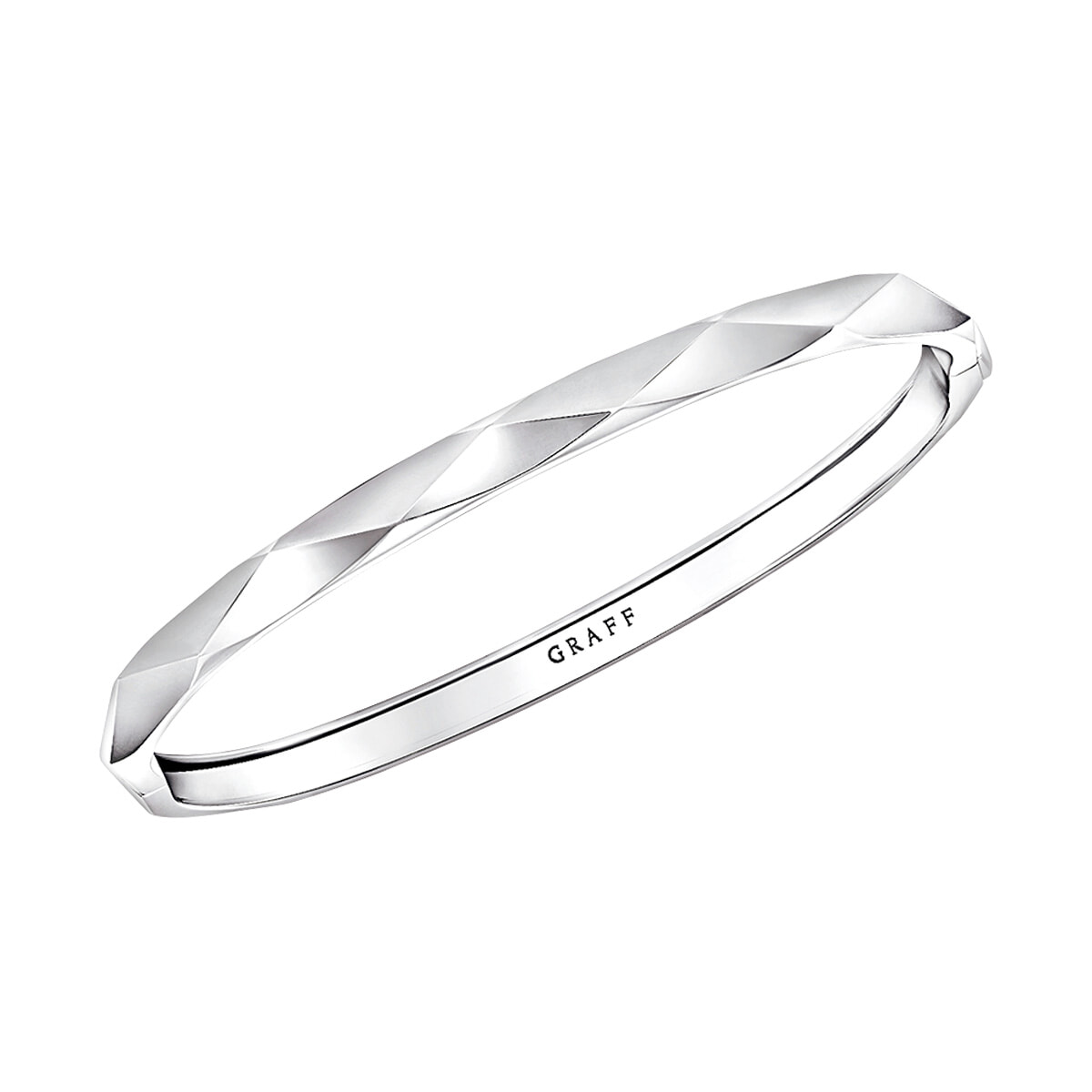ダイヤモンドのファセットに着想を得たコレクションにバングルが仲間入り。シンプルなメタルタイプのほかに、パヴェダイヤモンドをあしらったデザインも。「ローレンス グラフシグネチャー」(WG)¥1,235,000/グラフ(グラフダイヤモンズジャパン)