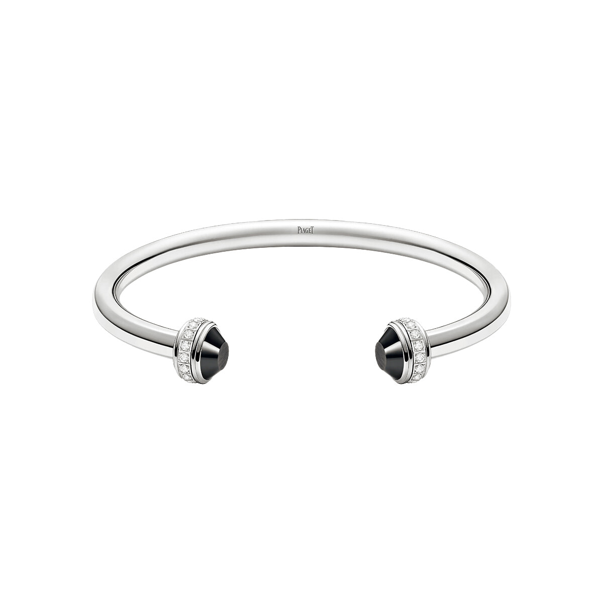 パンキッシュなムードの漂うモノトーンが魅力。メゾンのアイコンである回転するリングがブラックセラミックの周りで輝き、エレガンスをプラス。バングル「ポセション」(WG×ブラックセラミック×ダイヤモンド)¥2,050,400/ピアジェ(ピアジェ コンタクトセンター)