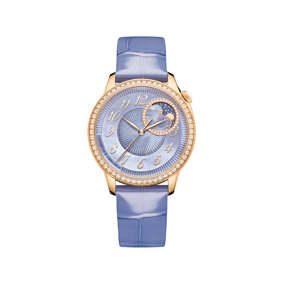 オートクチュールデザイナーのイーキン・インとコラボ。プリーツのモチーフにライラック色で白昼夢を体現。「エジュリー・ムーンフェイズ」(PG×ダイヤモンド×ミシシッピアリゲーターレザーストラップ、φ37mm、自動巻き、数量限定)¥6,160,000/ヴァシュロン・コンスタンタン
