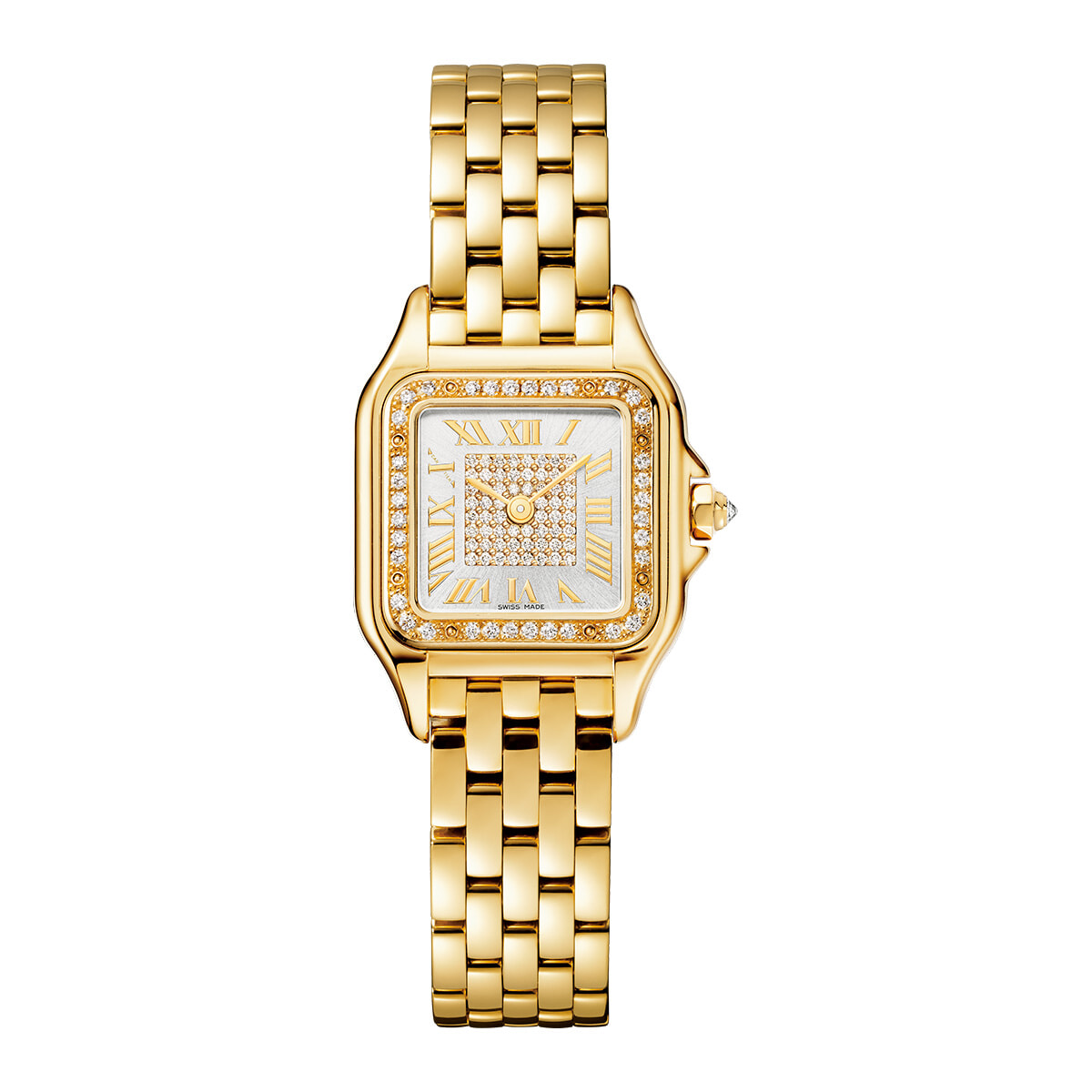 ベゼルに36石、ダイアルに60石のブリリアントカットダイヤを贅沢に敷き詰めた、グラフィカルな新作。「パンテール ドゥ カルティエ」(YG×ダイヤモンド、H30.3×W22mm、クオーツ)¥4,554,000/カルティエ(カルティエ カスタマー サービスセンター)