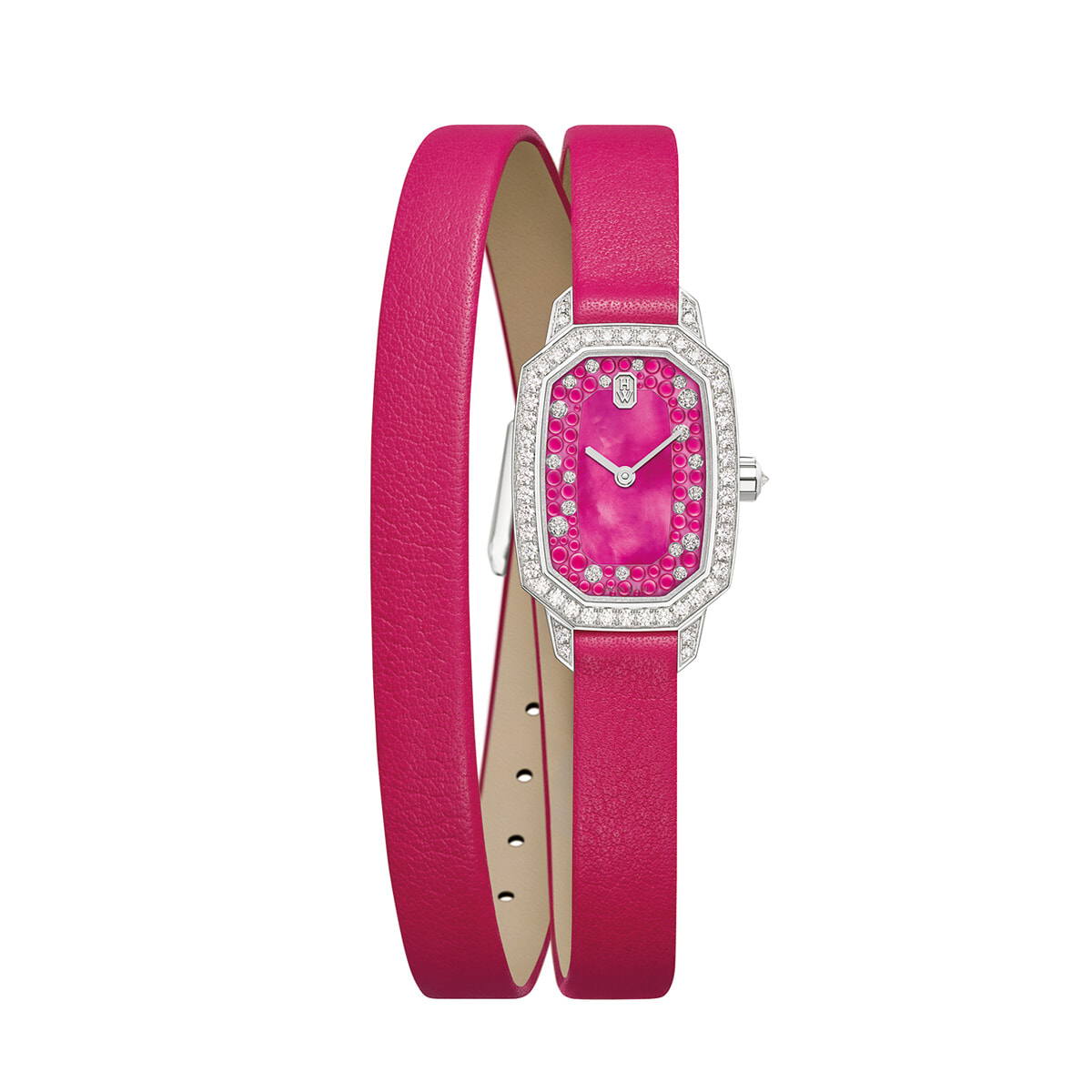 創始者が愛したダイヤモンドのフォルムを象ったデザインに新色のキャンディピンクが鮮やか。「HW エメラルド」(WG×ダイヤモンド×カーフスキンストラップ、H24×W17.7mm、クオーツ)¥2,178,000/ハリー・ウィンストン(ハリー・ウィンストン クライアントインフォメーション)