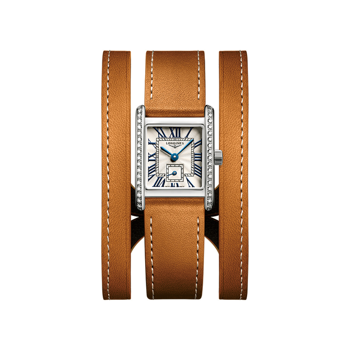 人気モデルをルーツに昨年登場したミニサイズがさらに進化。重ね着けしたようなストラップがモダン。「ミニ ドルチェヴィータ」(SS×ダイヤモンド×レザーストラップ、H29×W21.5mm、クオーツ)¥561,000/ロンジン(ロンジン/スウォッチ グループ ジャパン)