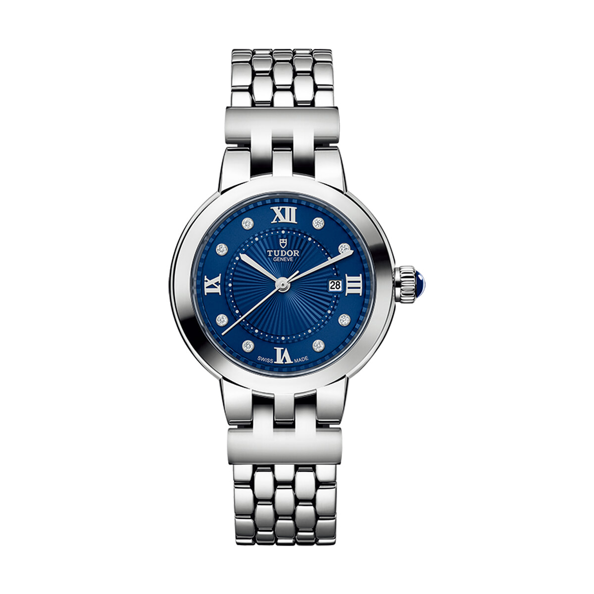 クラシカルなスタイルが人気のラインに、シグネチャーカラーのブルーが登場。浮き彫りの繊細なダイアルにダイヤのインデックスがアクセント。「クレア ドゥ ローズ」(SS×ダイヤモンド、φ30mm、自動巻き)¥456,500/チューダー(日本ロレックス/チューダー)
