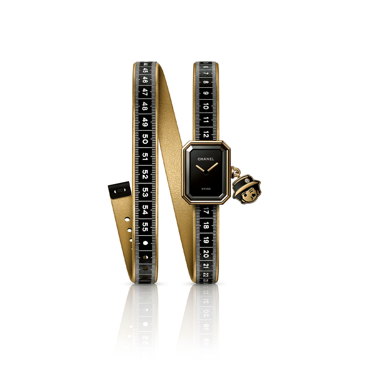 マドモアゼルのアトリエにあるお針子道具が着想源! その遊び心にときめく。「プルミエール リボン クチュール」(YG×ダイヤモンド×チタニウム×ブラックラッカー×レザー、H19.7×W15.2mm、クオーツ、数量限定)¥1,617,000/シャネル(シャネル カスタマーケア)