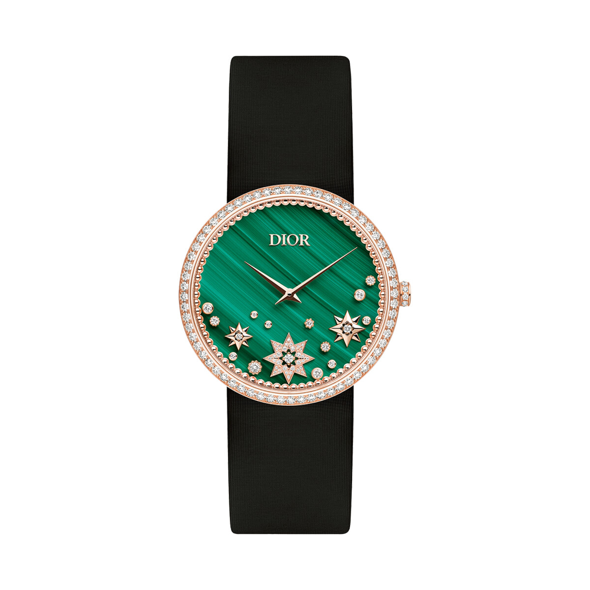 新たなスターモチーフのアイコンが誕生。48石のダイヤ煌めくマラカイトのフェイスが軽やかに時を告げる。「ラ デドゥ ディオール エトワール デ ヴァン」(PG×サテンストラップ、φ38mm、クオーツ)¥9,800,000/ディオール タイムピーシズ(クリスチャン ディオール)