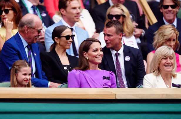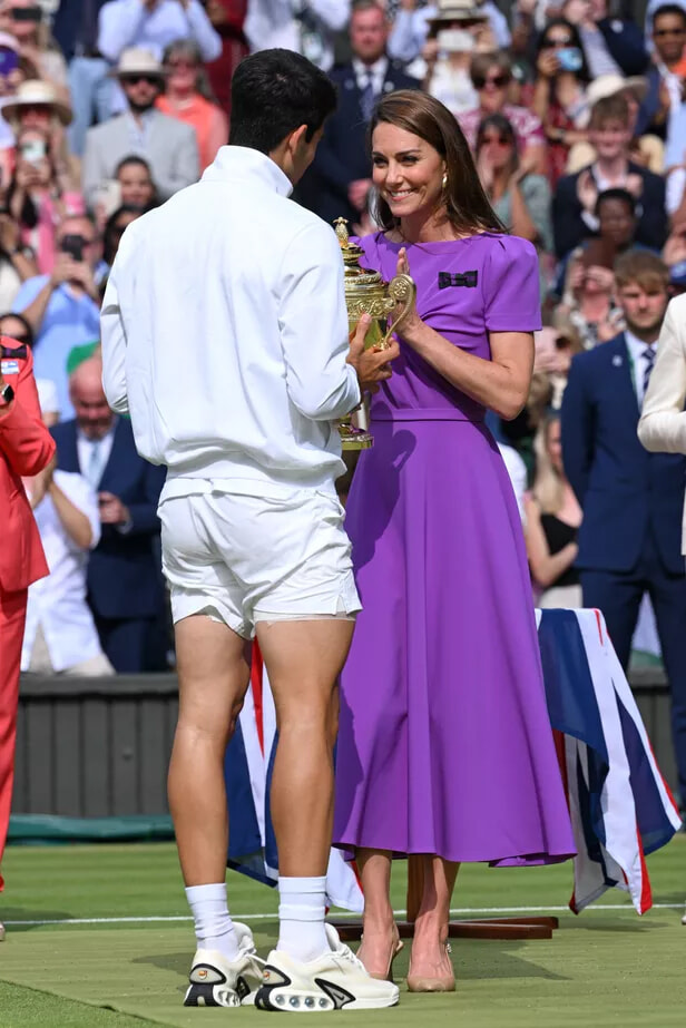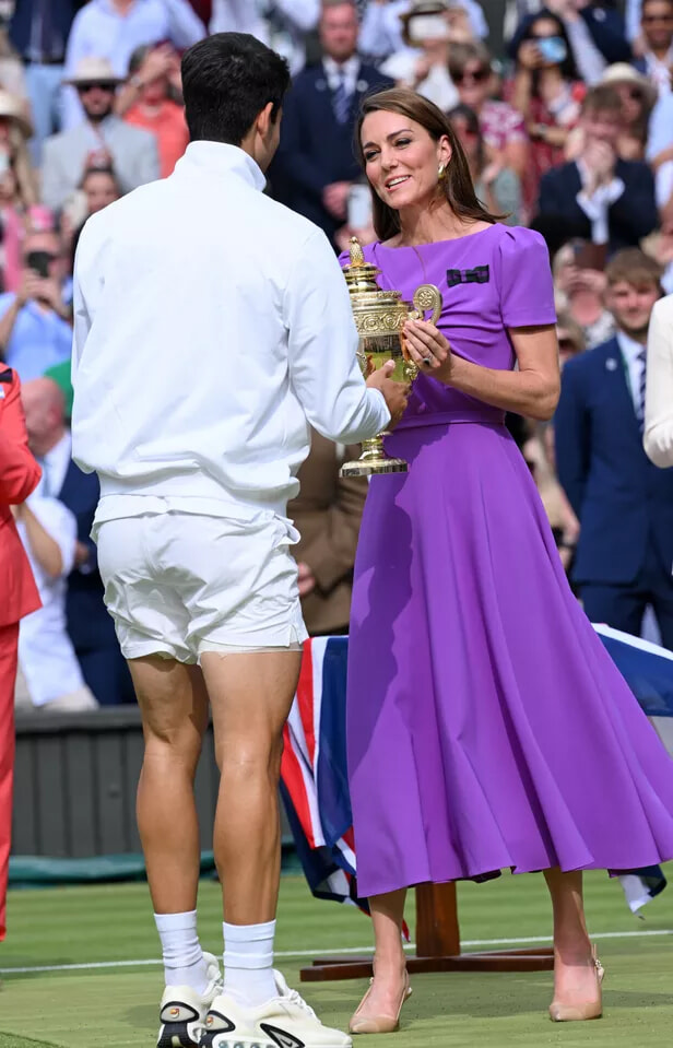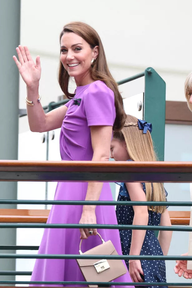 キャサリン皇太子妃は7月14日、ウィンブルドン選手権の観客席で紫色のドレスで登場した。また、皇太子妃は男子シングルスの決勝戦の優勝者にトロフィーを授与した。