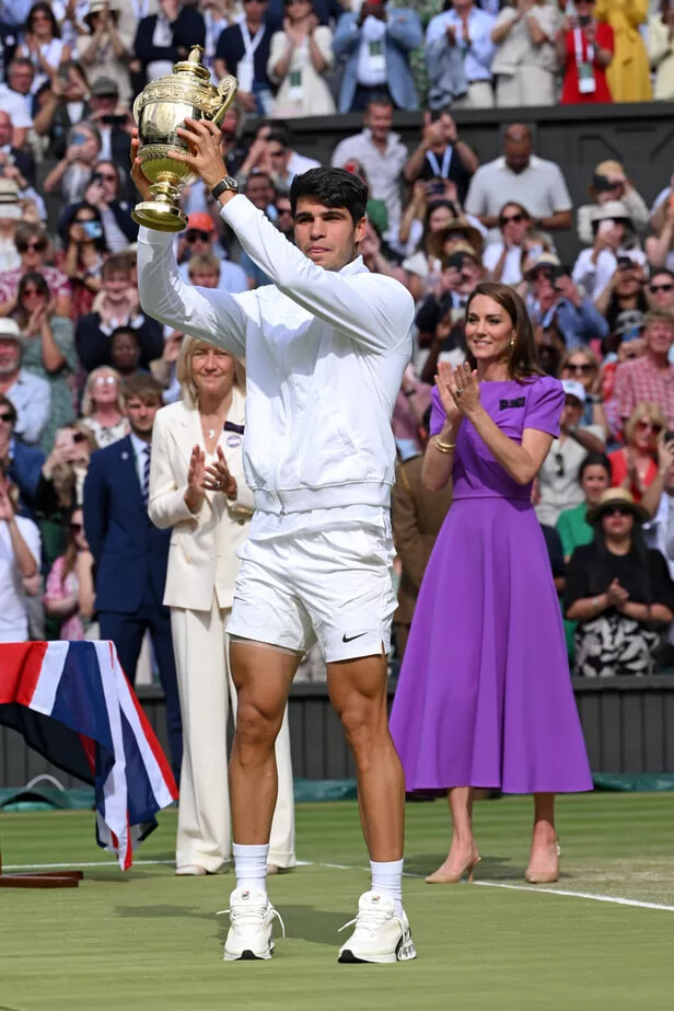紫色のドレスに身を包んだキャサリン皇太子妃は、イベント中、満面の笑みを浮かべていた。熱心なテニスファンである皇太子妃は、その後、大会の優勝者であるスペインのカルロス・アルカラスにトロフィーを贈呈した。カルロス・アルカラスは、セルビアのノバク・ジョコビッチと対戦した。皇太子妃は3月末、Instagramの動画でガンの「予防的な化学療法」を受けていることを発表した。キャサリン皇太子妃が公の場に再登場したのは、国王チャールズ3世の公式誕生日を祝う「トゥルーピング・ザ・カラー」パレードが行われた6月15日だった。その際、皇太子妃はバッキンガム宮殿のバルコニーで王室の家族と一緒に群衆に挨拶した。
