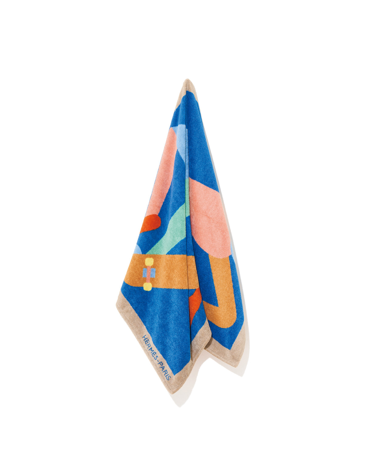 スケートボードやサッカーなどのスポーツモチーフをあしらったビーチタオル。表面はポップなミックスカラー、裏面はオレンジ一色でハッピームード全開。厚手かつ大判なので砂浜に広げたり多様に活躍しそう。(150×90cm)¥110,000/エルメス(エルメスジャポン)