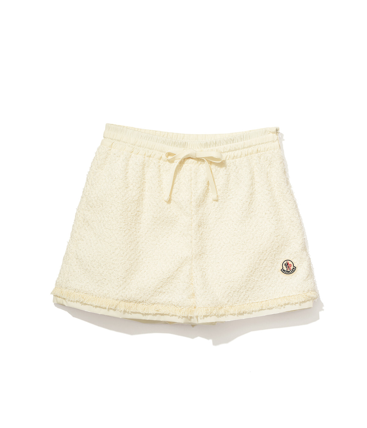 カジュアルなナイロン素材と上品なツイード素材が組み合わさったハイブリッドなショートパンツ。ほのかに温かみのあるホワイトのフリンジとナイロンの裾のレイヤードが新鮮。浜辺で軽快にはきこなしたい。¥107,800/モンクレール(モンクレール ジャパン)
