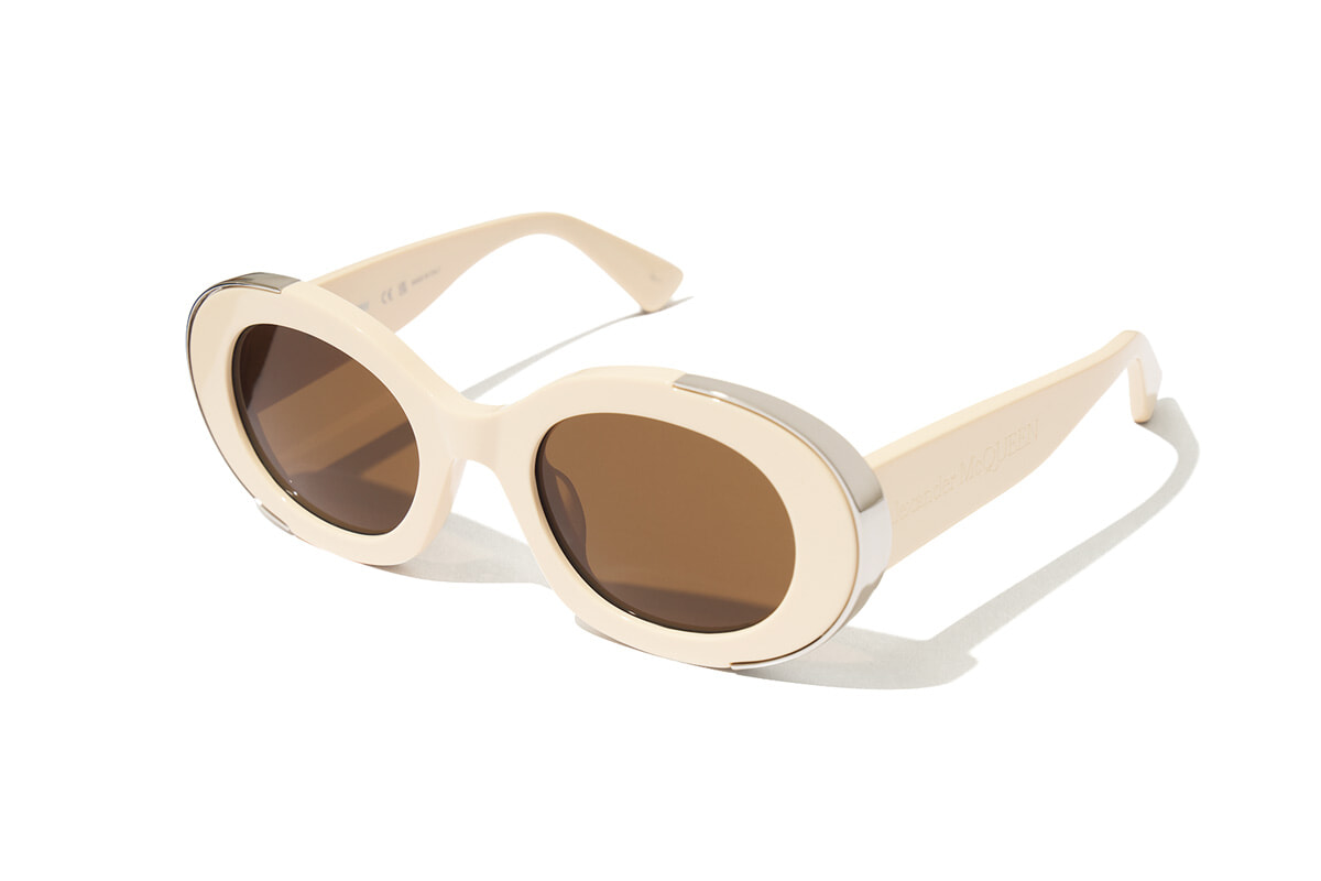 100%UVカットのソリッドブラウンレンズが施されたオーバル形のサングラス。フレームの両サイドがシルバーメタルの仕様になっていて、角度によって表情の変化が楽しめるフューチャリスティックなデザイン。¥61,600(参考価格)/アレキサンダー・マックイーン