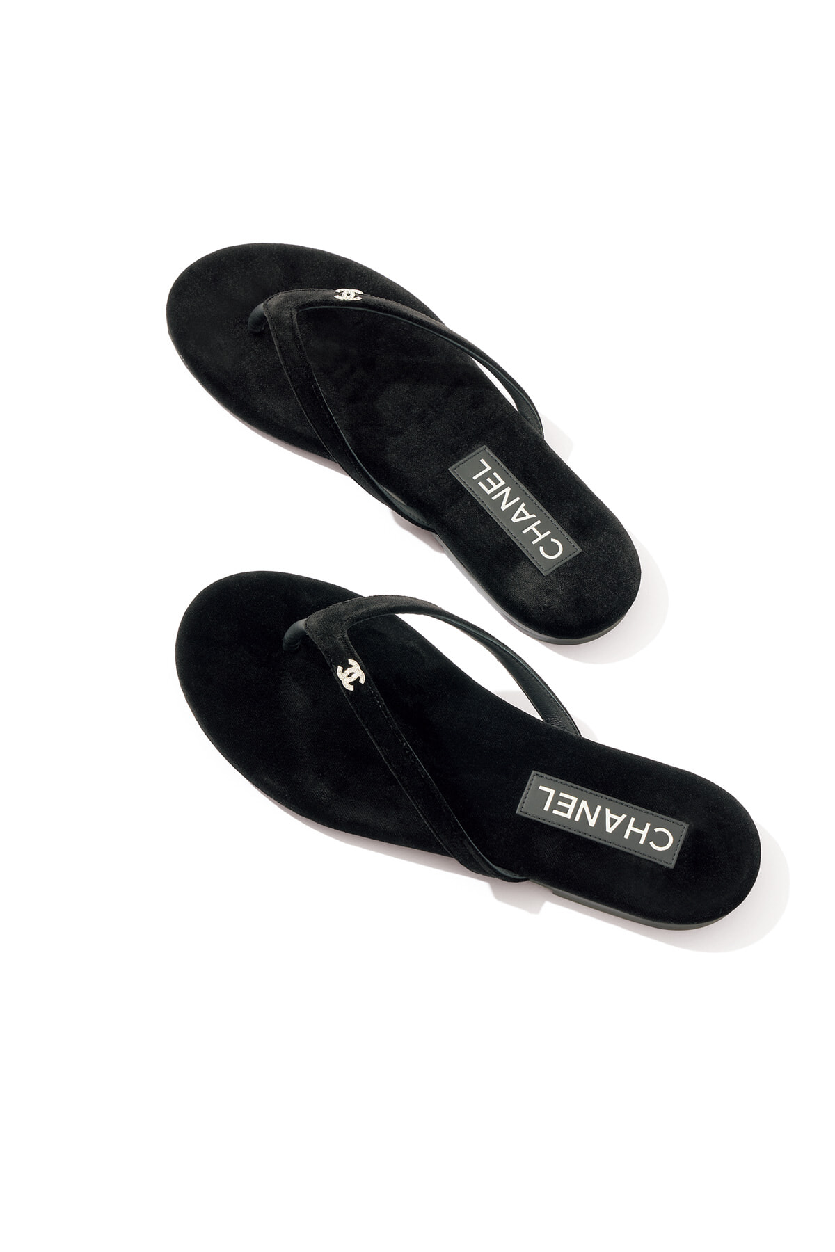 カジュアルになりすぎず洗練されたベルベットのサンダルは、リゾートシーンのみならず都会の街歩きにも最適。漆黒のトングにきらりと光るストラスのダブルCが愛らしいアクセントを添える。(ヒール0.5cm)¥149,600/シャネル(シャネル カスタマーケア)