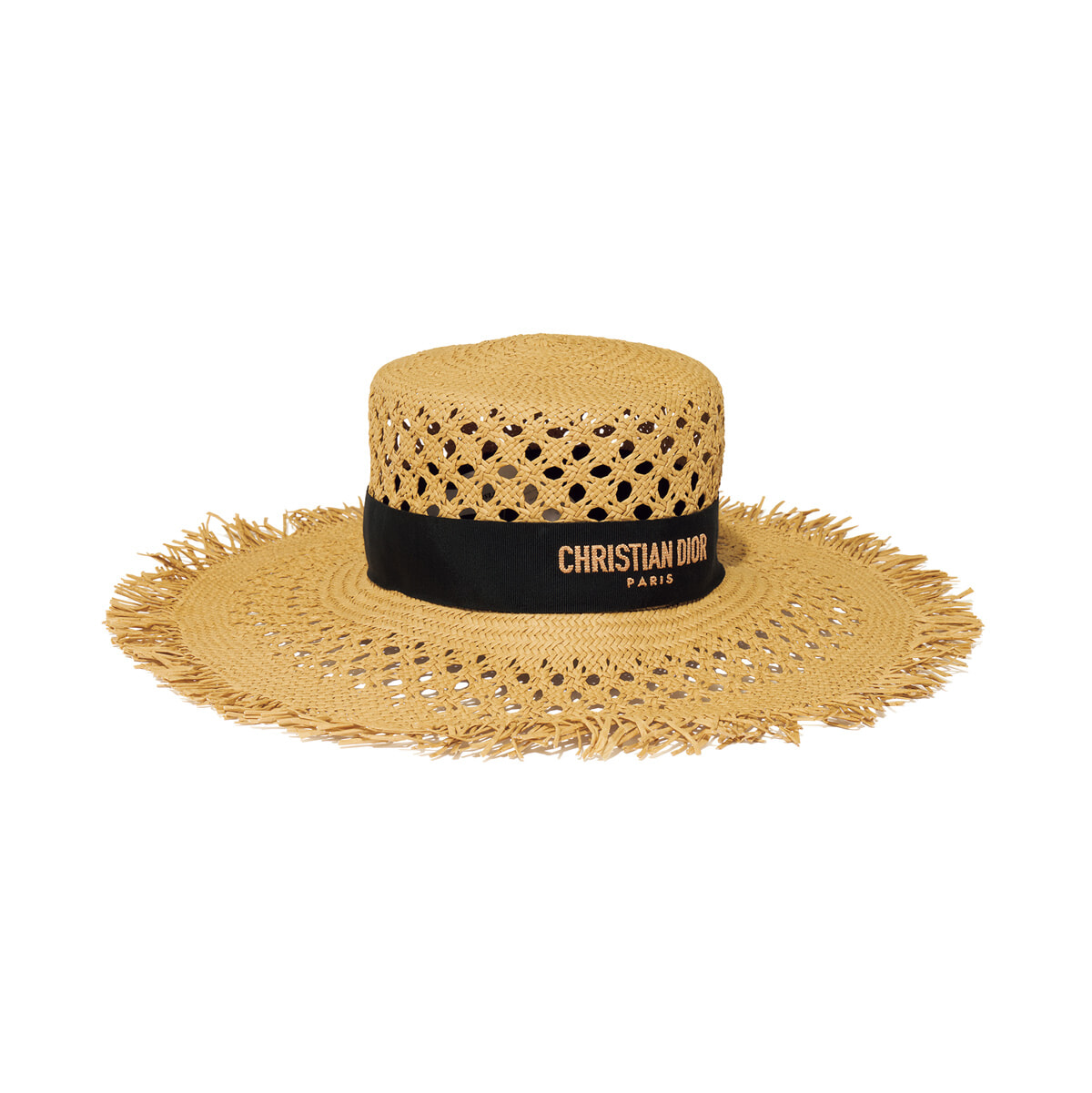 リゾートスタイルにぴったりのエレガントなストローハットがお目見え。手編みされたストローやブリムのフリンジなど、細部にも手仕事が光る。刺繍入りのブラックバンドでモダンなアティチュードを添えて。¥145,000/ディオール(クリスチャン ディオール)