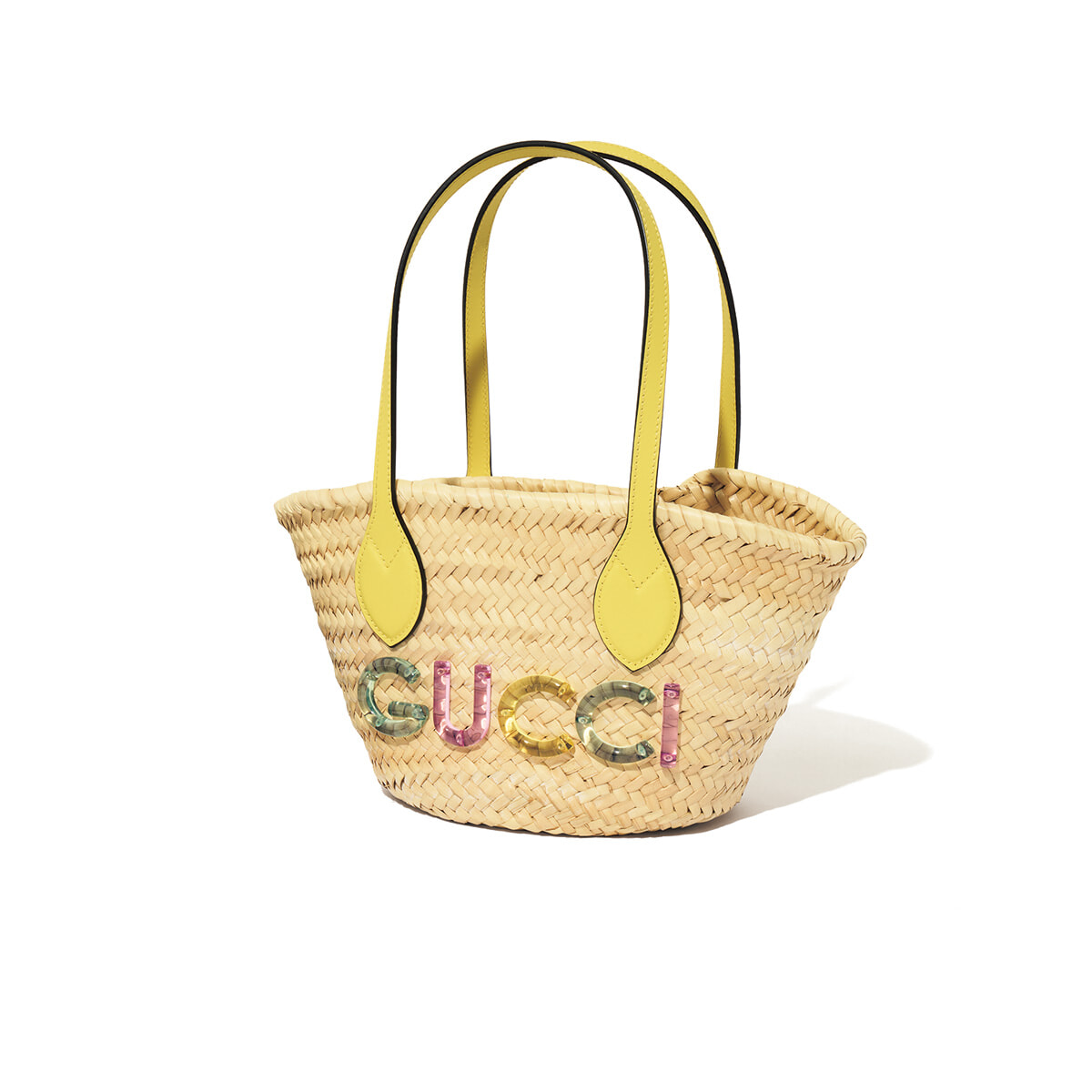 レモンイエローのレザーハンドルが映える涼しげなパルミート素材のミニバッグ。夏の陽射しに煌めく、キャンディのような鮮やかなプレキシグラスのブランドネームが乙女心をくすぐる。(H19.5×W20.5×D13cm)¥205,700/グッチ(グッチ クライアントサービス)