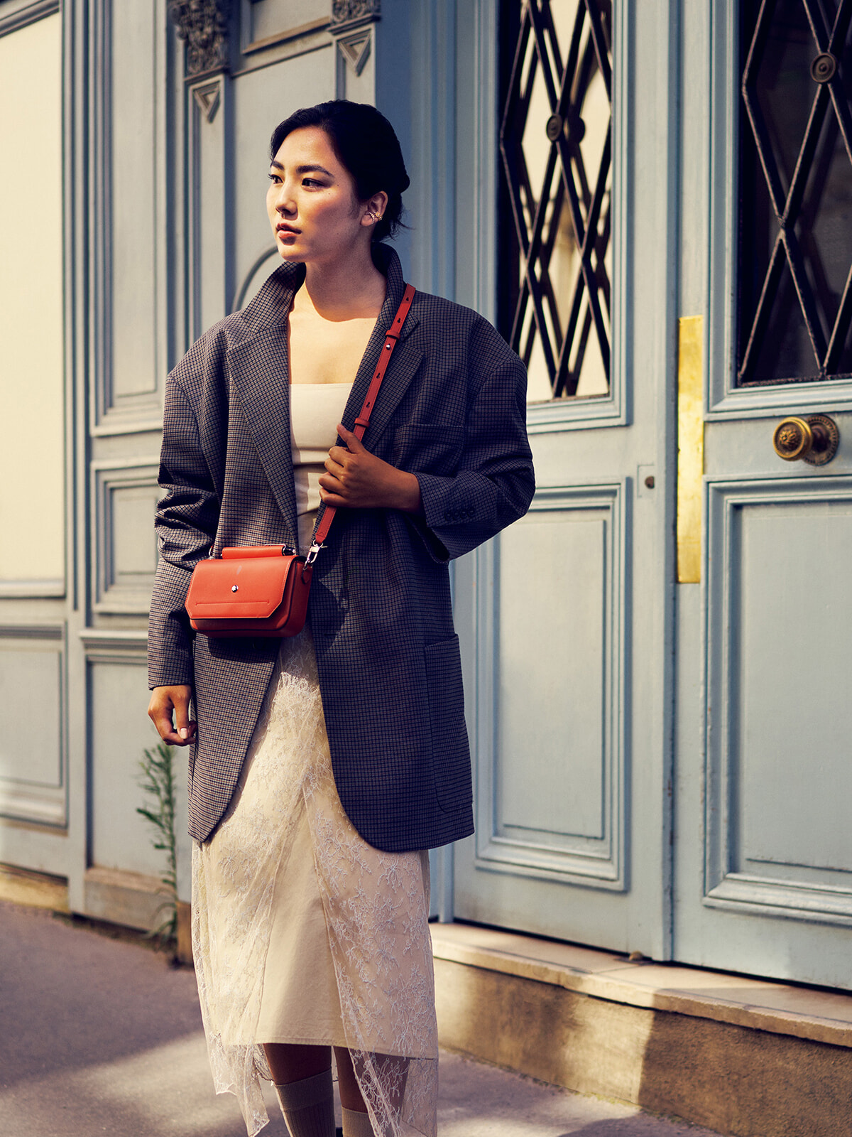 ロンドン、ニューヨークを経て今年からパリの大学院で学生生活を送っている伽羅。パリでは古着屋巡りが好きで、最近ヴィンテージのレザーバッグを購入したばかり。祖母の形見であるレザーのショルダーバッグも、傷んだストラップを付け替えて大切に使っている。「出かける場所や用途によって合わせるバッグも変えるので、洋服をコーディネートする時は、まずバッグから組み立てます」。この日合わせたモンブランのソフト ミニバッグはアクセサリー感覚で使いたいと言う。