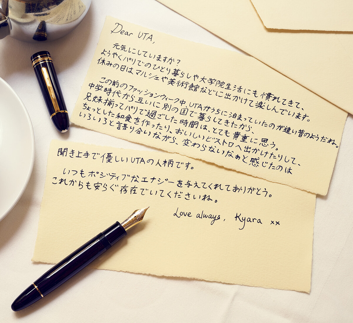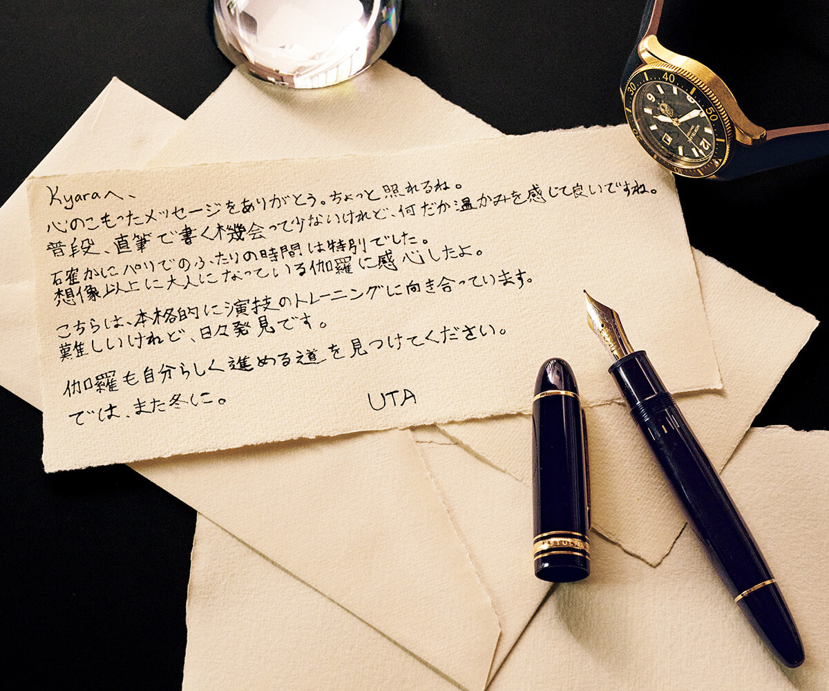 エッセイストとして活躍する内田也哉子を母親に持つふたりは、手書きで原稿を書くその姿が印象に残っているという。「物心ついた時から母親の机にはいつもモンブランの製品がありました。キャップの先にデザインされた白いエンブレムは見慣れていたので、親近感があります」と伽羅。「書く」ことを通じて家族の思い出を共有するUTAと伽羅の手紙には、多くを語らずとも深い家族の絆にあふれている。