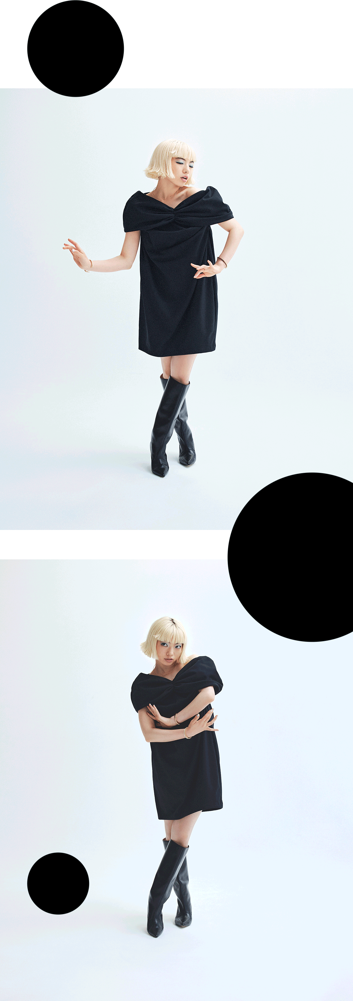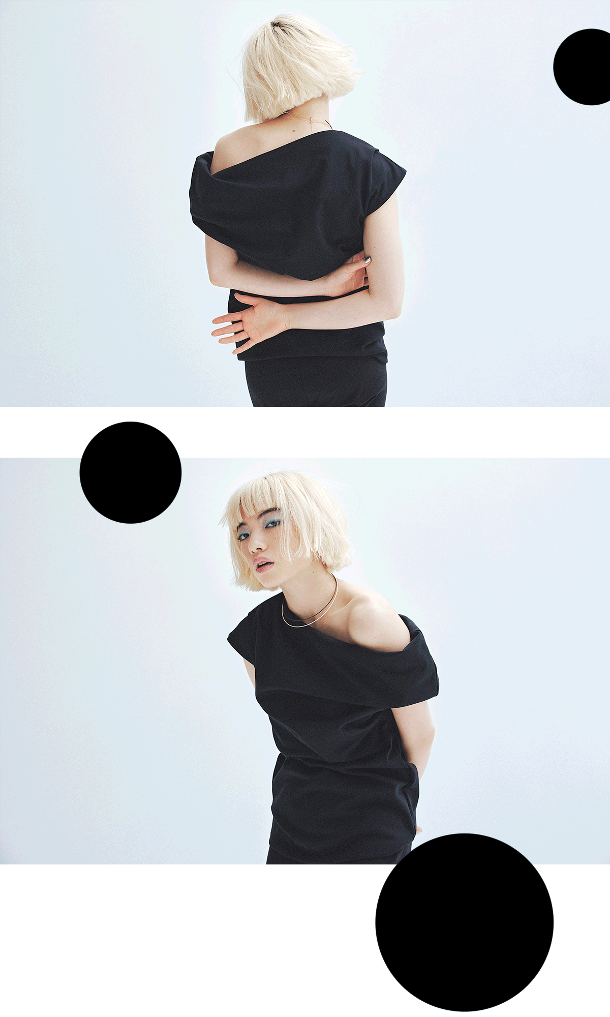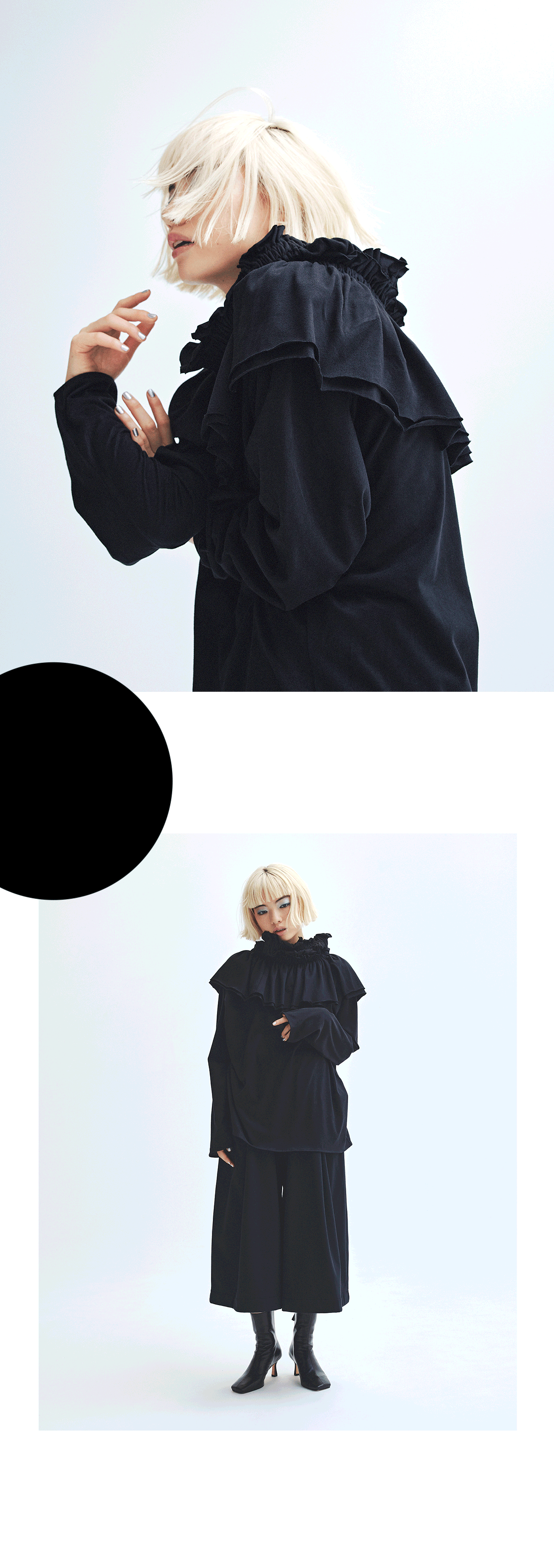 「黒は私にとって緊張感のある色。エディット・ピアフをはじめ、フランスの往年のスターは、みなさん素敵に黒を着こなしていますよね。そんなイメージもあって黒は特別なもの。背伸びをしながら今回の撮影に臨みましたが、緊張し過ぎずに着ることができたのは優しい肌触りのおかげなのだろうと思います。新しい洋服のデザインや色との出合いで、それまで知らなかった自分の一面を見つけることがありますが、そんな新たな自分に気がつけるコレクションです」(アオイヤマダ)