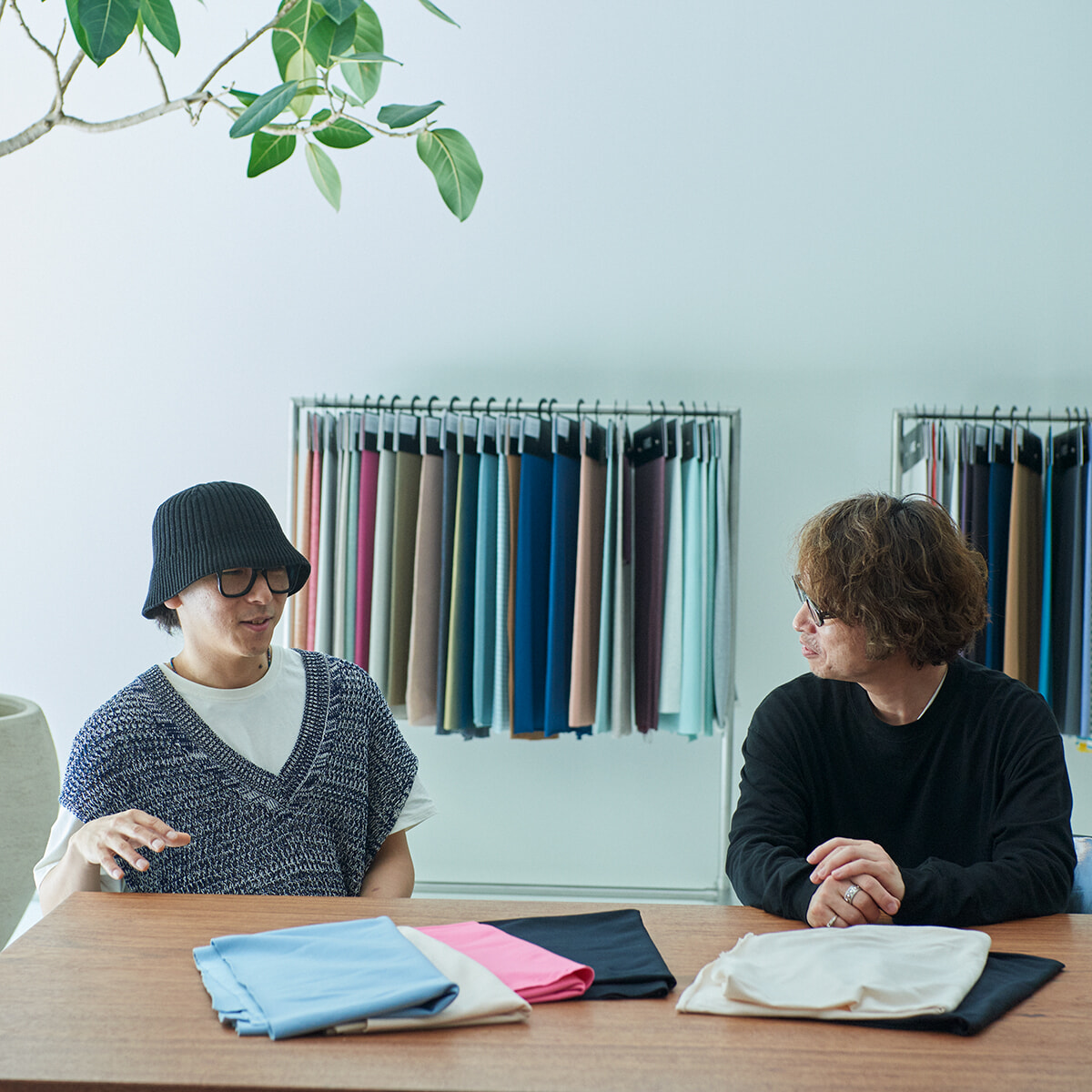 今回、新生ロペのクリエイティブディレクターに就任した齊藤 智(左)が手を組んだのは、和歌山でカットソー生地の開発と販売を行うエイガールズ。取締役を務めるクリエイティブディレクターの尾崎孝夫(右)と服作りへの想いを語り合った。1968年創業のロペはヨーロッパのファッションを取り入れながら日本の服飾文化を牽引。一方、エイガールズは1972年に創業し、国内向けに生産を続けながら時代の流れをいち早くつかみ、2004年にパリのテキスタイル国際見本市に進出。日本の高い技術力はヨーロッパで評価され、名だたるメゾンとコラボレーションを続けている。