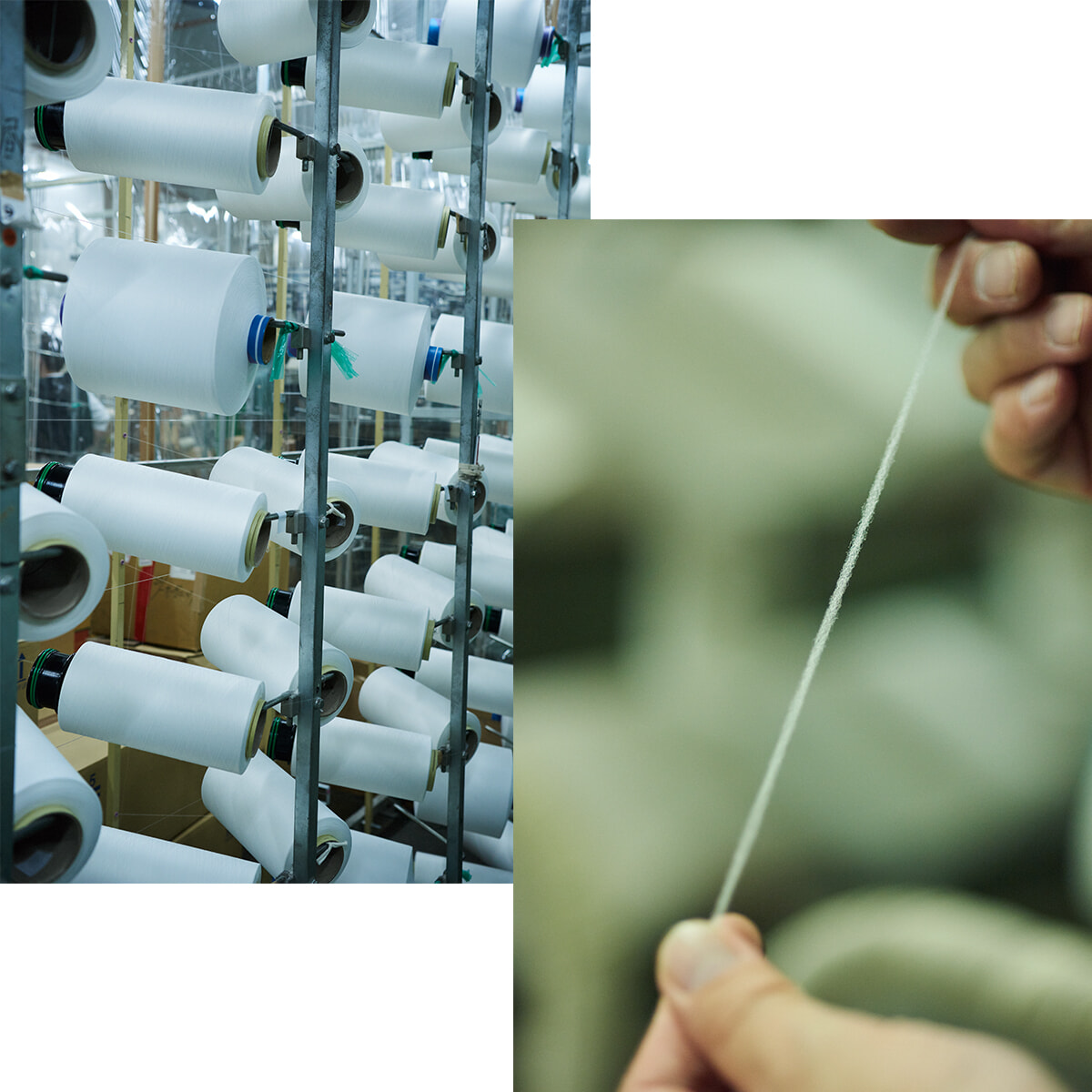 原料の糸にこだわっており、「ひとくちに綿といってもアメリカ、エジプト、インドと産地はさまざま。弊社では外国に特注した糸を和歌山のグループ会社で特別な撚りをかけ、オリジナルなものに仕上げます。糸本来の特性を生かすため編み機も使い分けています」。糸の製作にもオリジナルの技術をかけて手仕事でピンに糸をかけ、撚りをかけていく。独自加工した糸は伸縮性に加え、ふっくらとした風合いが出る。