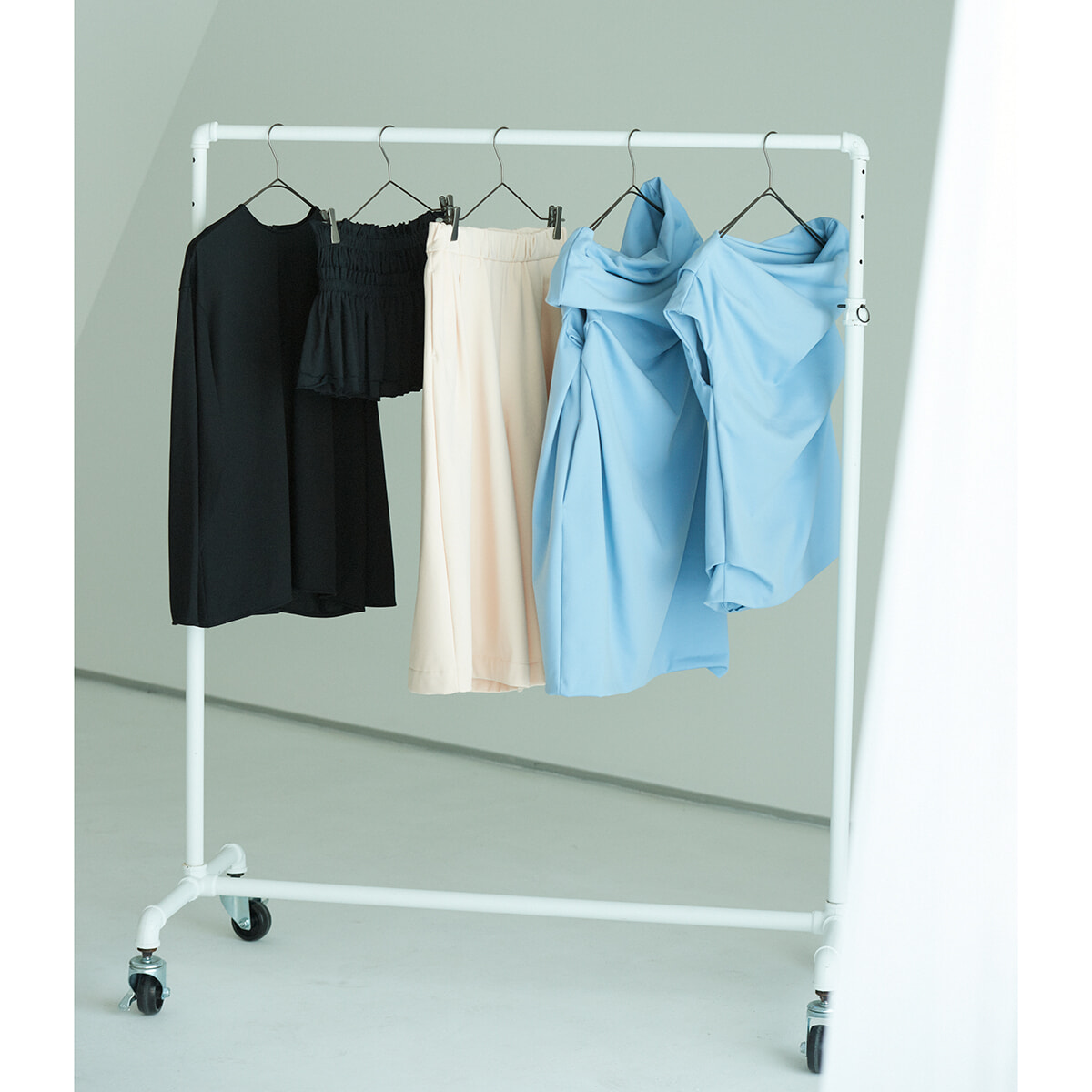 (画像左から)ベアトップ付きプルオーバー¥36,300、ワイドパンツ¥30,800、チュニックワンピース(参考色)¥38,500、プルオーバー¥23,100/以上ロペ(ジュンカスタマーセンター)