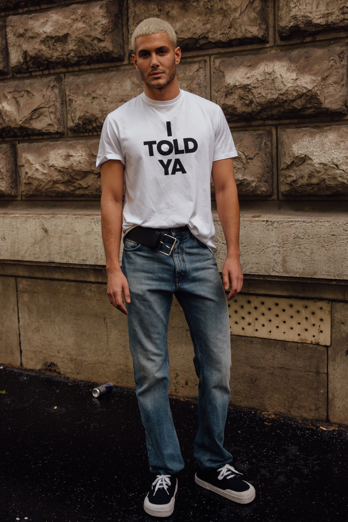 2025年春夏ロエベのメンズのショーに来場していたアーティストの顔も持つインフルエンサー、ファイ・カドラは、ベルトのパーツ付きのジーンズに「I TOLD YA」プリントTシャツを合わせていた。ロエベのクリエイティブディレクター、ジョナサン・アンダーソンが衣装を手がけた映画『チャレンジャーズ』で登場人物たちが着用していたアイテムで、シンプルながら存在感抜群。
