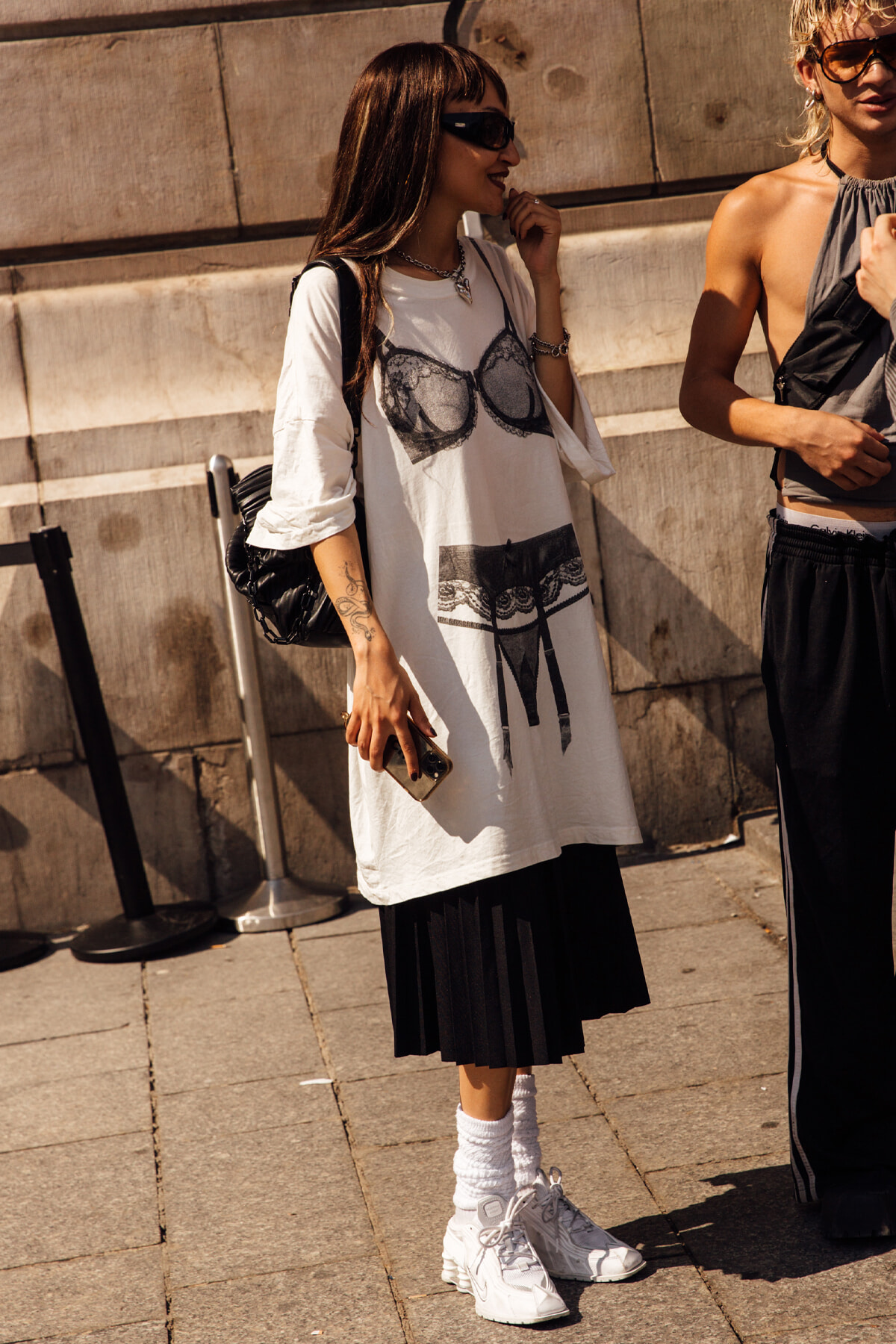 身体とぴったり合う位置にランジェリーのグラフィックがプリントされたオーバーサイズのTシャツはNY発のブランド、ヴァケラのもの。なんてことのないスタイリングでしかもモノトーンだが、プリントのインパクトが半端ない。スニーカーがマーティン ローズとナイキとのコラボというのもポイント高し。