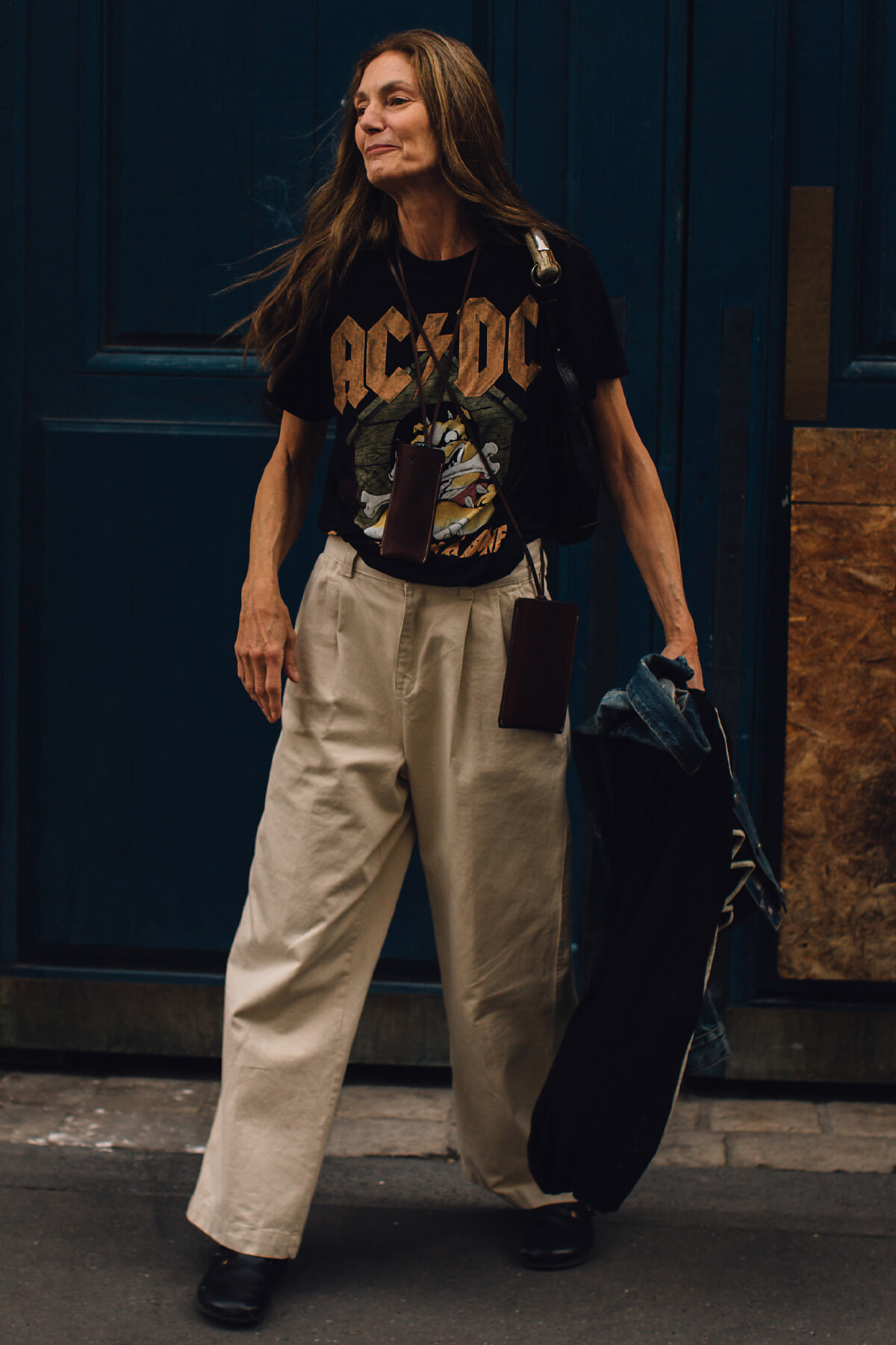 最後はロックT。こちらの方は着慣れた感じのチノパンを合わせ、ナチュラルなヘアメイク+ノーアクセでシックな方向に持っていっている。ハードな印象になっていないのは、プリントが落ち着いた色味だからかも。大人がロックTを着る時の参考になりそう。