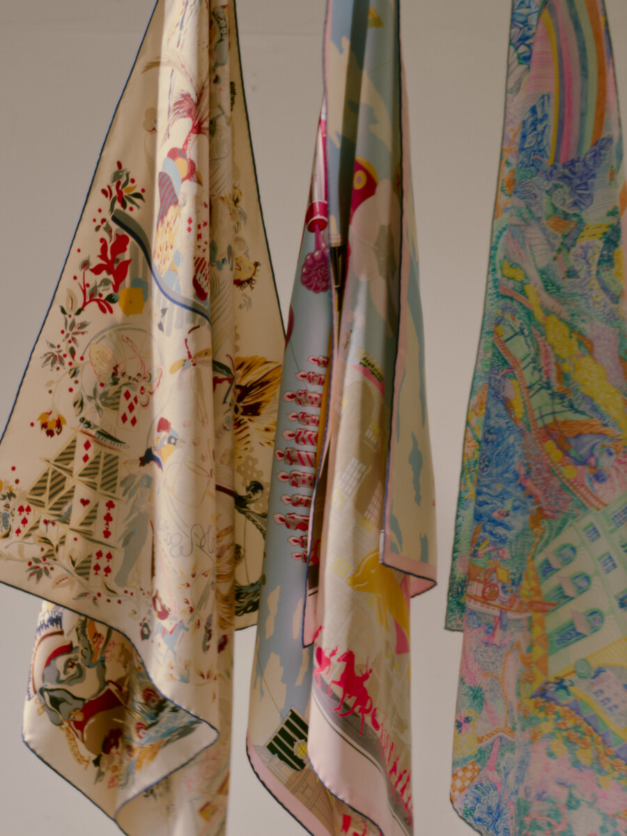 スカーフ(左から)カレ 90 「エミールの夜」、カレ 90「 エルメス・パラード」、カレ 90 「クレイジー・フォーブル」(H90×W90cm)各¥78,100/以上エルメス(エルメスジャポン)