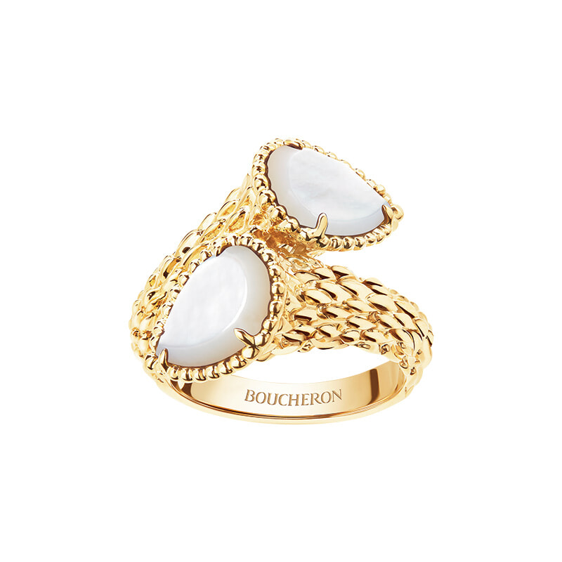 スネークの頭が重なり合う、”ふたりの絆”を表した幸福のモチーフ「セルパンボエム トワエモア」リング(YG×MOP)¥775,500(予定価格)/ブシュロン(ブシュロン クライアントサービス)