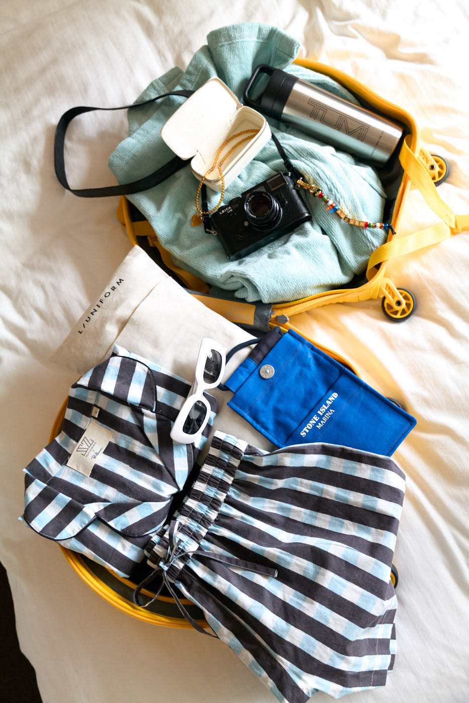 キャリーケースの中には、特別な時間を満喫するためのアイテムをリストアップ。観光のおともには2重構造の真空断熱ステンレスボトルや両手があくショルダーポシェット、そしてまだまだ活躍する日差し対策のサングラス……。最後に夜を快適に過ごすためのパジャマを詰め込んで、自分らしい旅をアシスト。