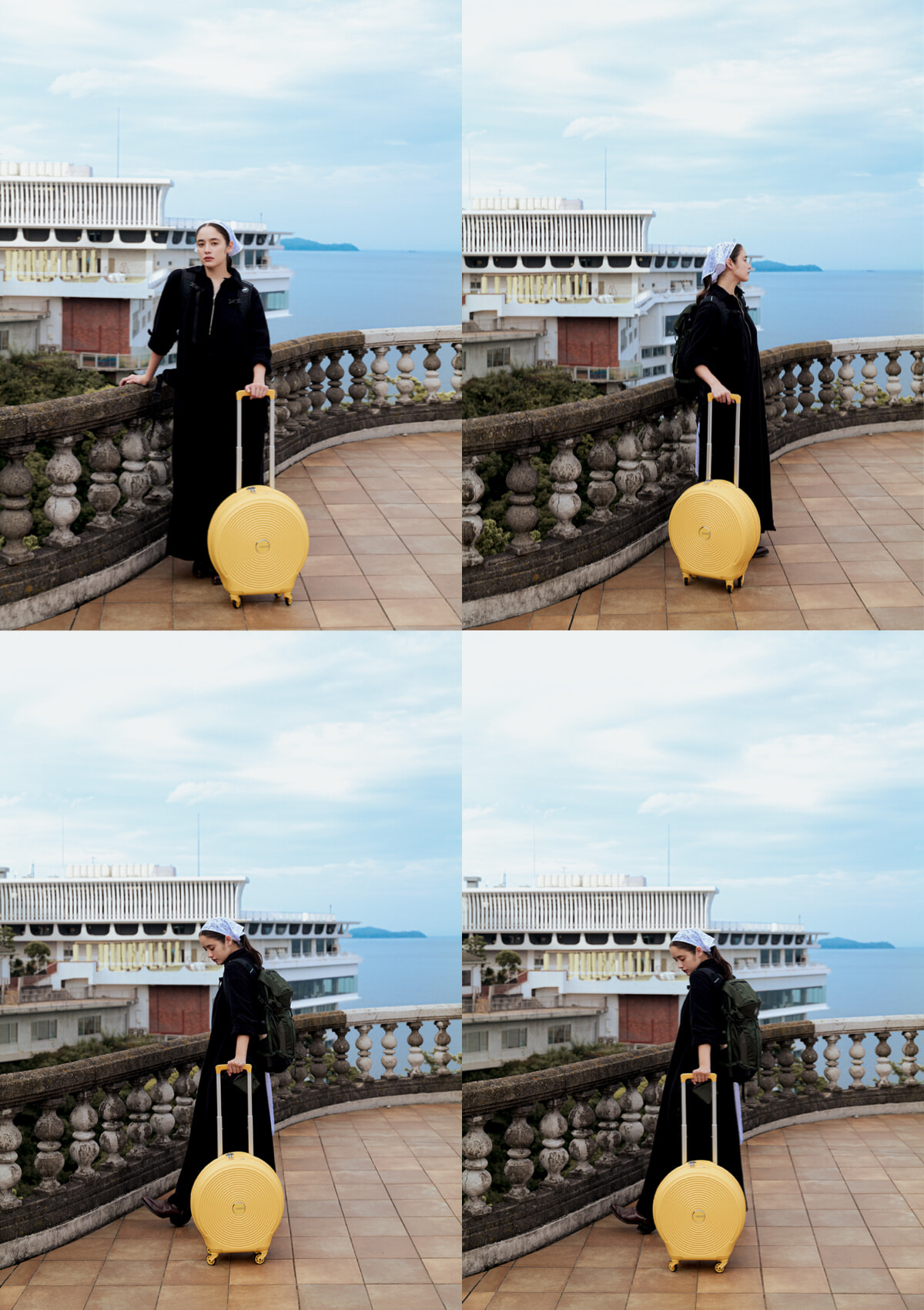 キャリーケース¥27,500/アメリカンツーリスター(サムソナイト・ジャパン) スーツケースの中身写真上から時計回りに:ウォーターボトル¥12,100/トゥミ(トゥミ・カスタマーセンター) バスローブ¥23,100/ロンハーマン 小物入れ¥15,400/アエタ ネックレス¥25,300(オンラインストア限定)/レヴェンス(RHC ロンハーマン) カメラに付けたチャーム¥61,600/アンブッシュ® (アンブッシュ® ワークショップ) クッション¥24,000/リュニフォーム(リュニフォーム トウキョウ) ポシェット¥38,500/ストーンアイランド(ストーンアイランドジャパン) サングラス¥51,040/ケイト×オリバーピープルズ (ルックスオティカジャパン カスタマーサービス) パジャマシャツ¥28,600、パンツ¥20,900/ともにエスゼット ブロックプリント(ロンハーマン)