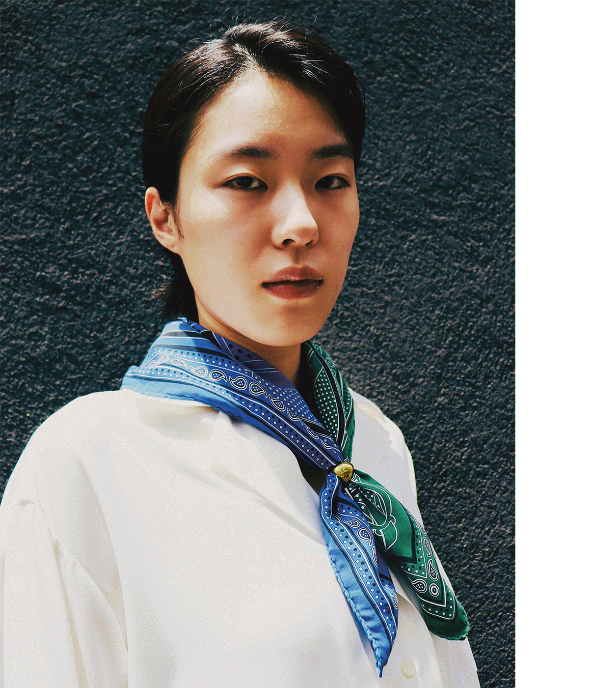 エルメスのスカーフはシルクだから張りがあってとても綺麗なんです。それをあえて、くしゃくしゃにしてこなれた感じにするのが好きで。スカーフって単体で考えるとフォーマルなものだと思うんですが、そこを味のある雰囲気にカジュアルダウンさせたり、着け方で力を抜いたり。ものによっては、自分で半分にカットしたスカーフもあるんです。さすがシルクだなと思ったのは、切りっぱなしにしてもなかなかほつれない!