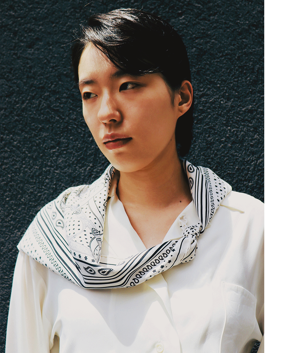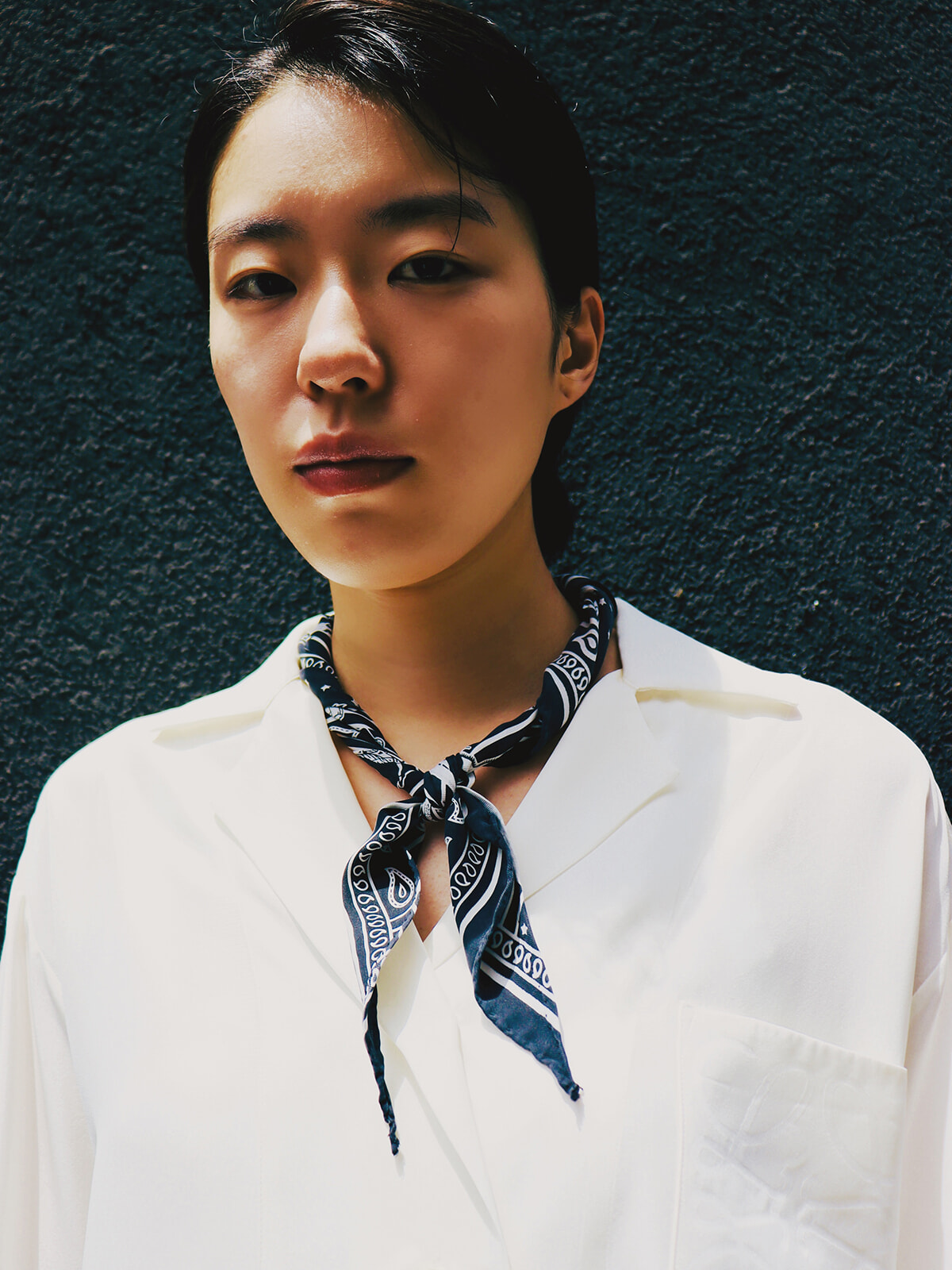 飯島さん流の巻き方その1.ベーシックなパリジャン風のバンダナ巻き。スカーフを半分にカットし、ネッカチーフのように。捻ってタイトにしたことで首元のボリュームがすっきり。