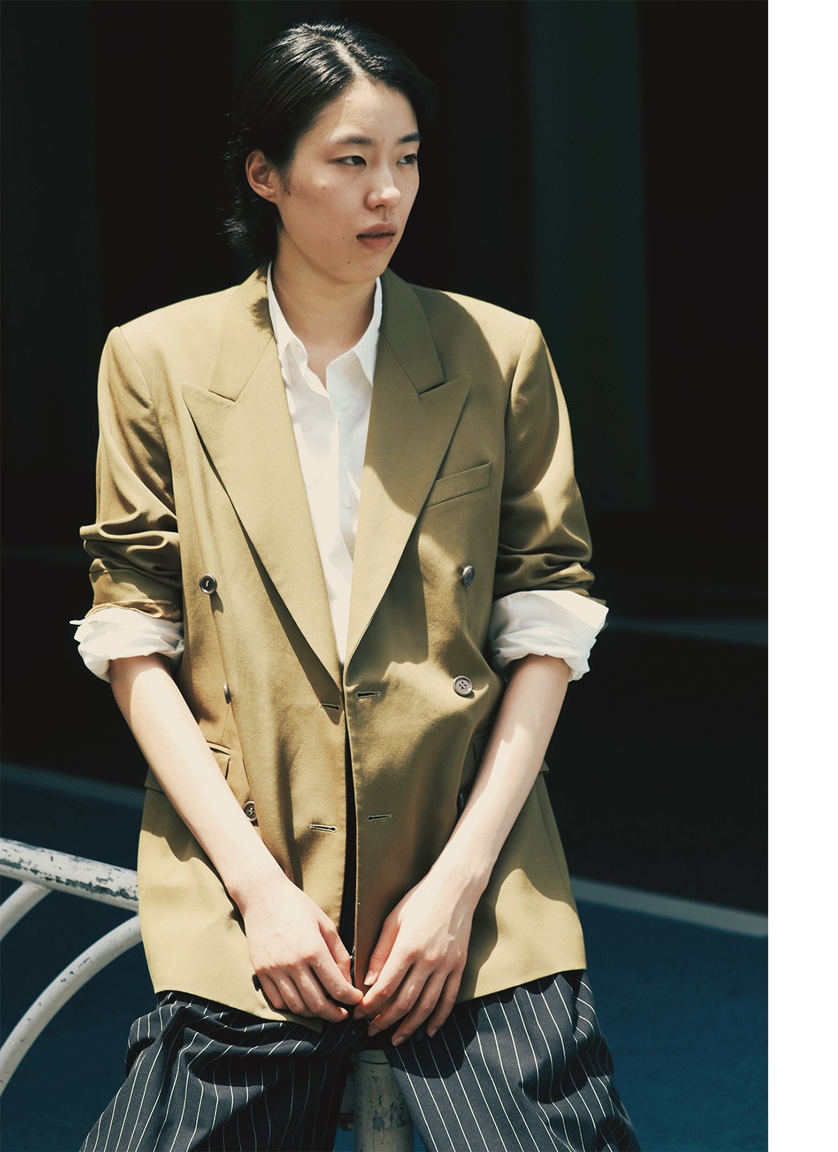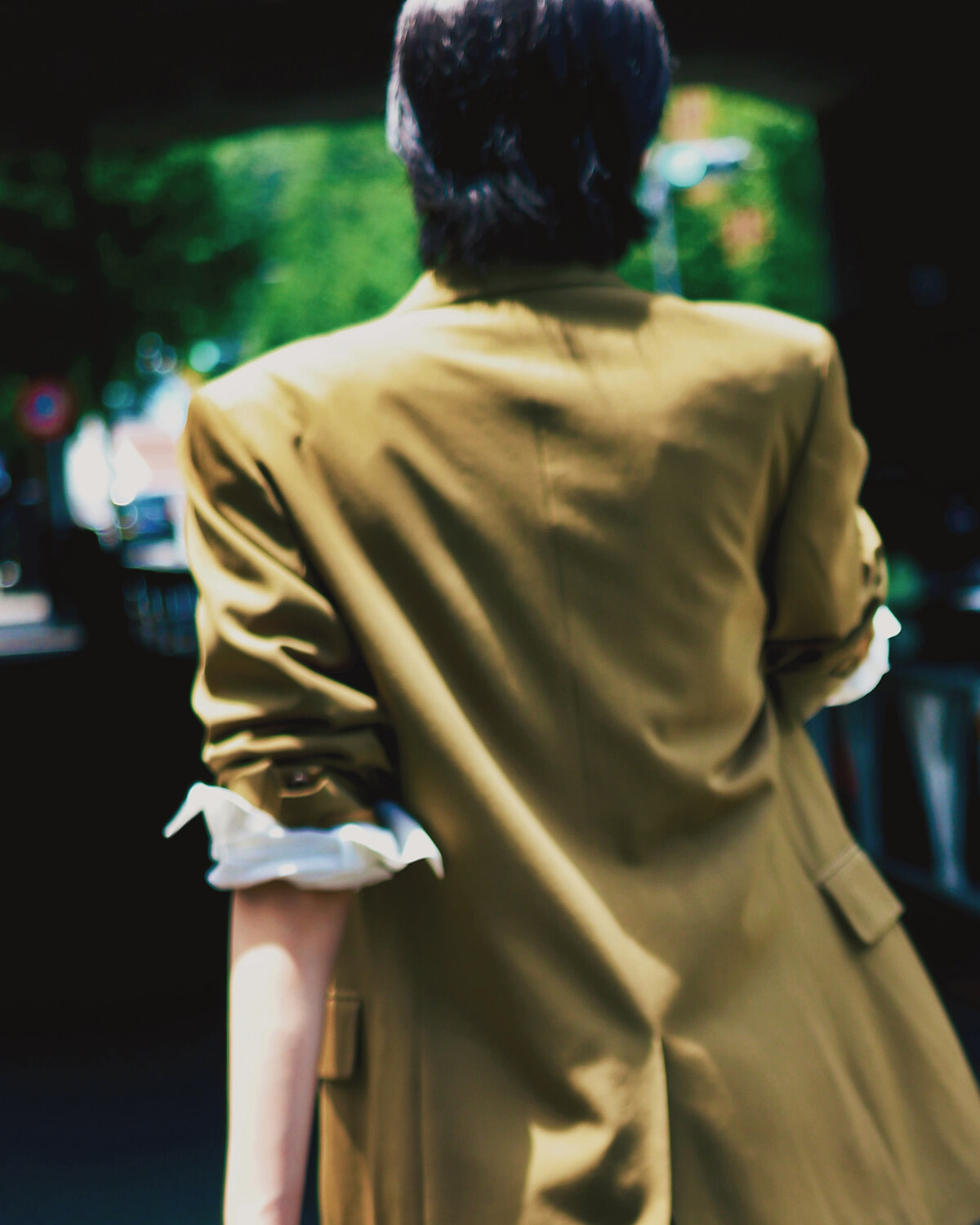 品格を演出してくれるジャケットですが、こちらも袖をくしゃっと折ったりして着崩すのが好き。無造作ともまたちょっと違う感覚で、自分流に着るみたいな。着こなし方って、その人の性格や好みがそのまま現れるものだと思うので、まさにそれが個性になるんだと思います。