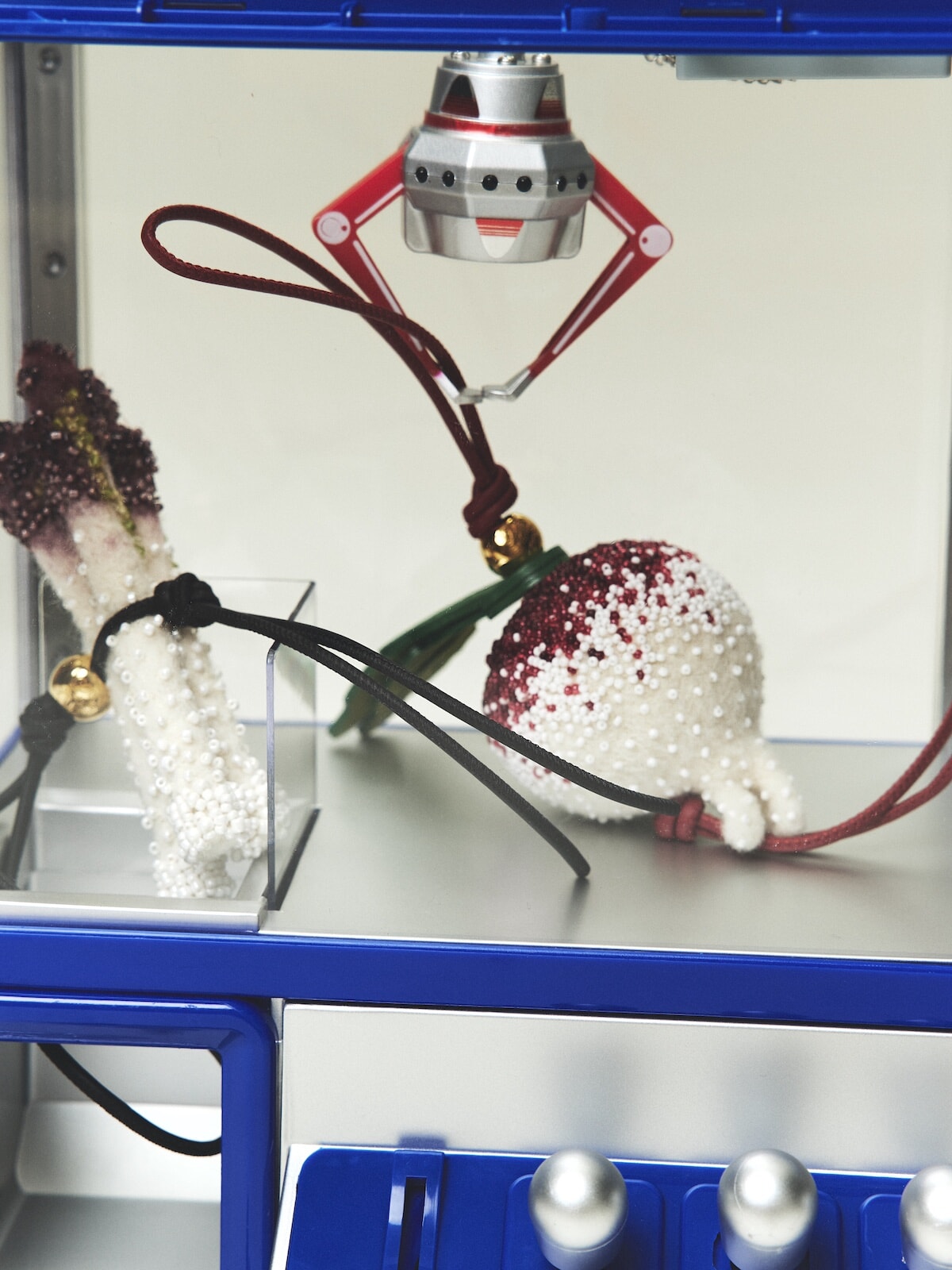 繊細なビーズ使いとシニカルなモチーフが新鮮なアクセントを添える。