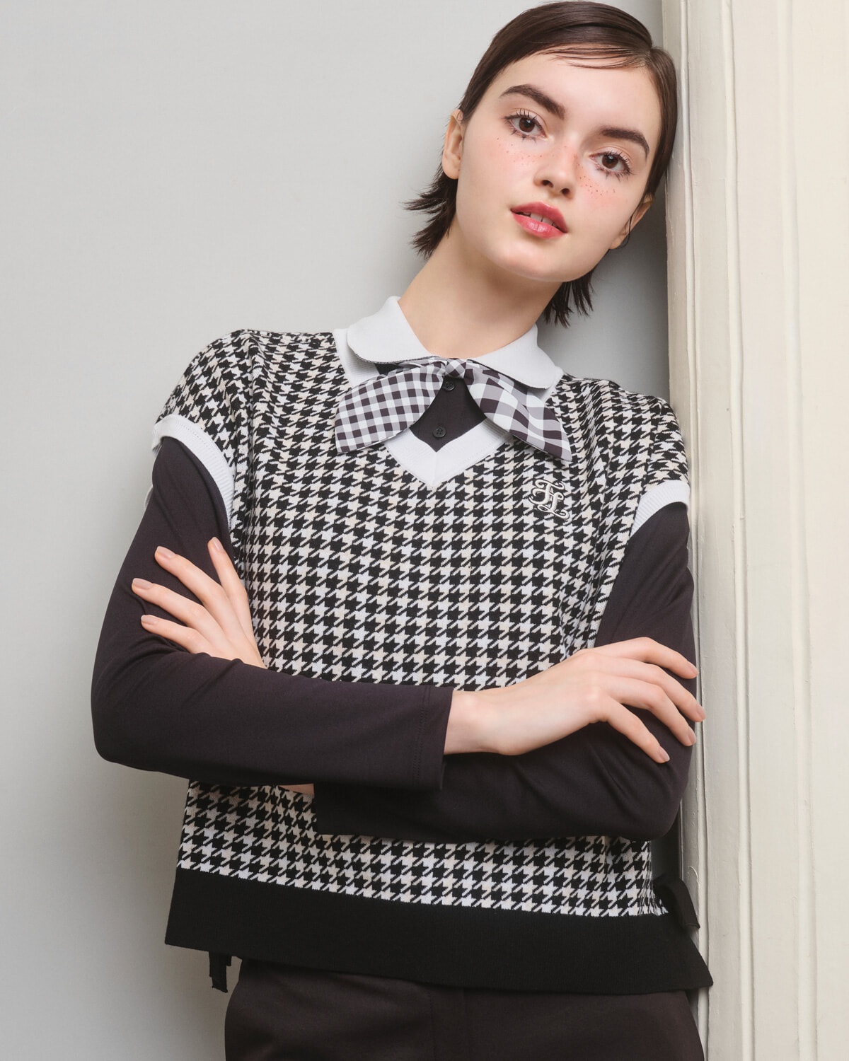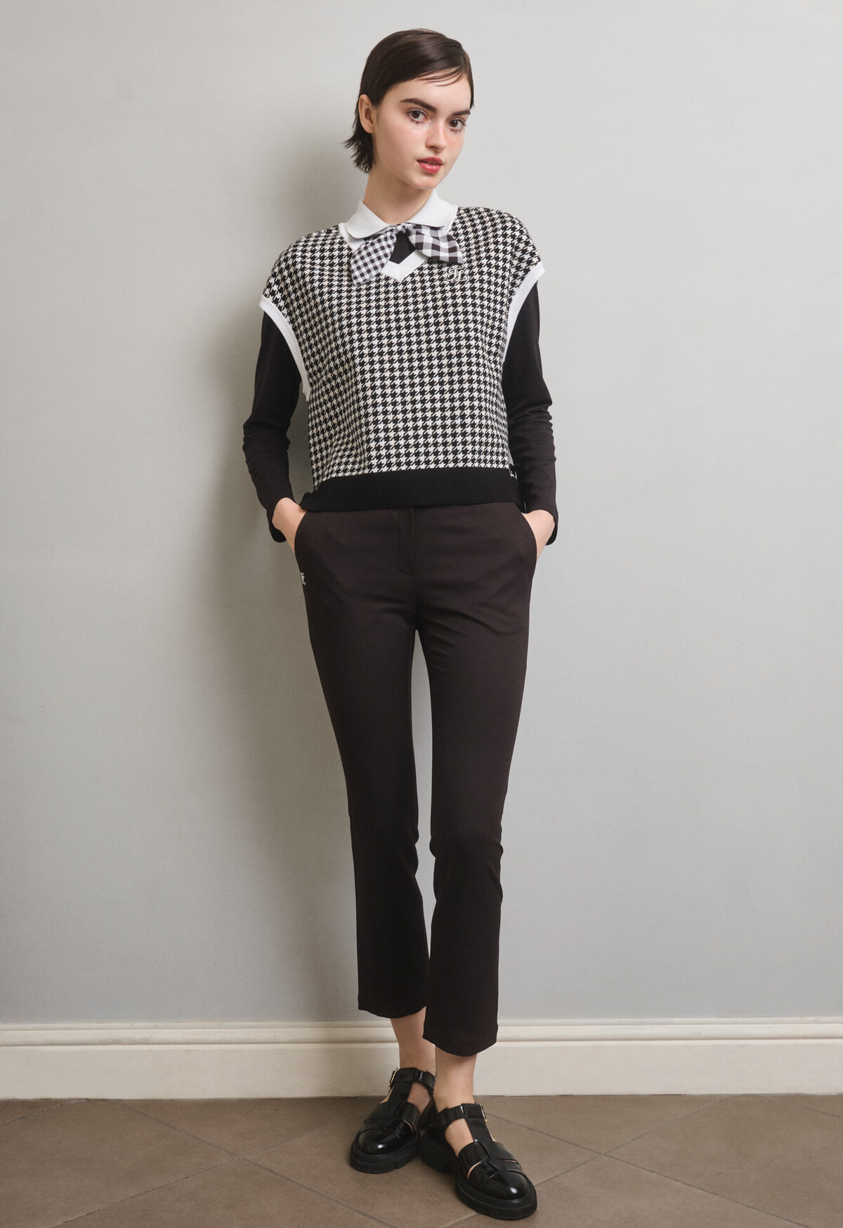リボンやプリーツが目を引くキュートなコレクションから、ハウンドトゥースのレトロポップなスタイルにフォーカス! ジャカードベストにブランドアイコンのリボン付き長袖Tシャツをインして、美しいフォルムが目を引くフィットパンツもブラックでモード感を。遊び心のあるモノトーンスタイルが新しい秋のおしゃれを彩る。