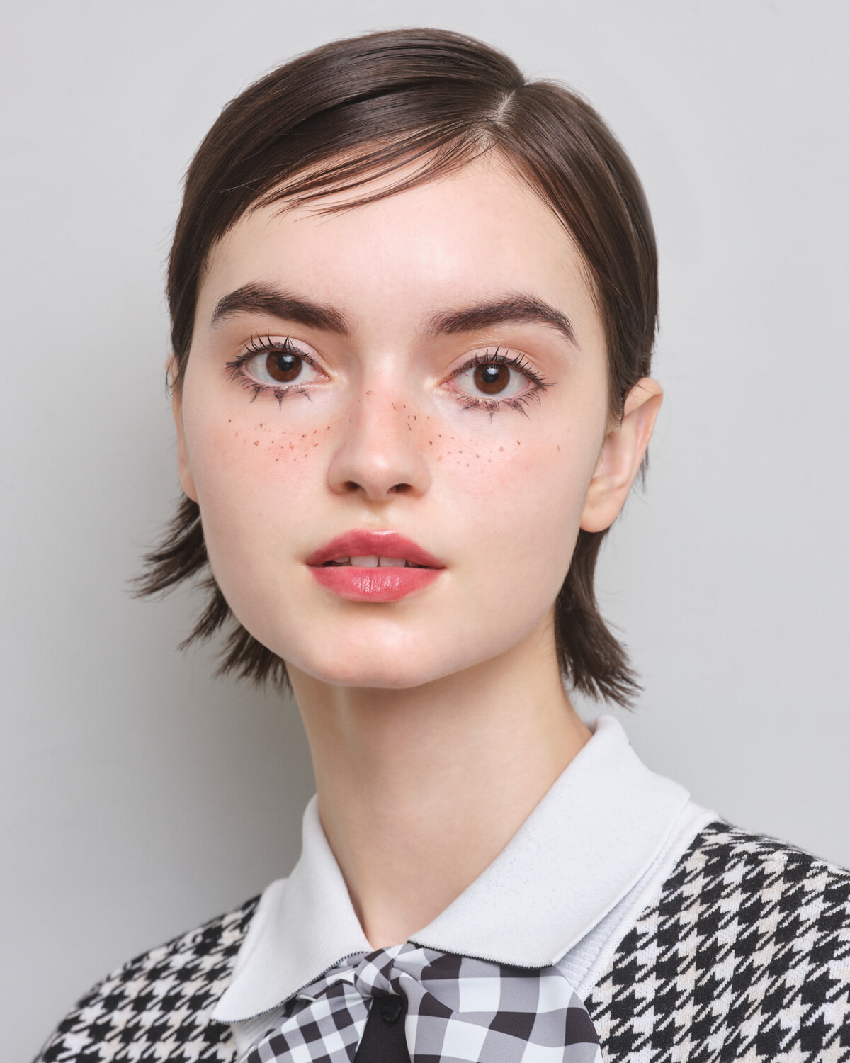 レトロシックなモノトーンのチェックの着こなしには、60年代のパリをイメージさせるポップなメイクアップがマッチ。黒目の上のまぶたには、目の丸さを強調するようにブラックのアイライナーで目尻が短めの太いアイラインを。下まぶたにはアイライナーでバランスよくまつ毛を3カ所、さらにシアーブラウンのアイライナーで顔の中心寄りにソバカスをウエイビーに描く。塗るだけで自然な束ができるWPコームのマスカラで、しっかりとまつ毛をアップさせて、モダンな目元が完成。