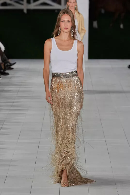 ラルフ ローレンでは、金糸の入った華やかなスカートが真っ白なシンプルなトップスと見事に調和していた。photography: Launchmetrics