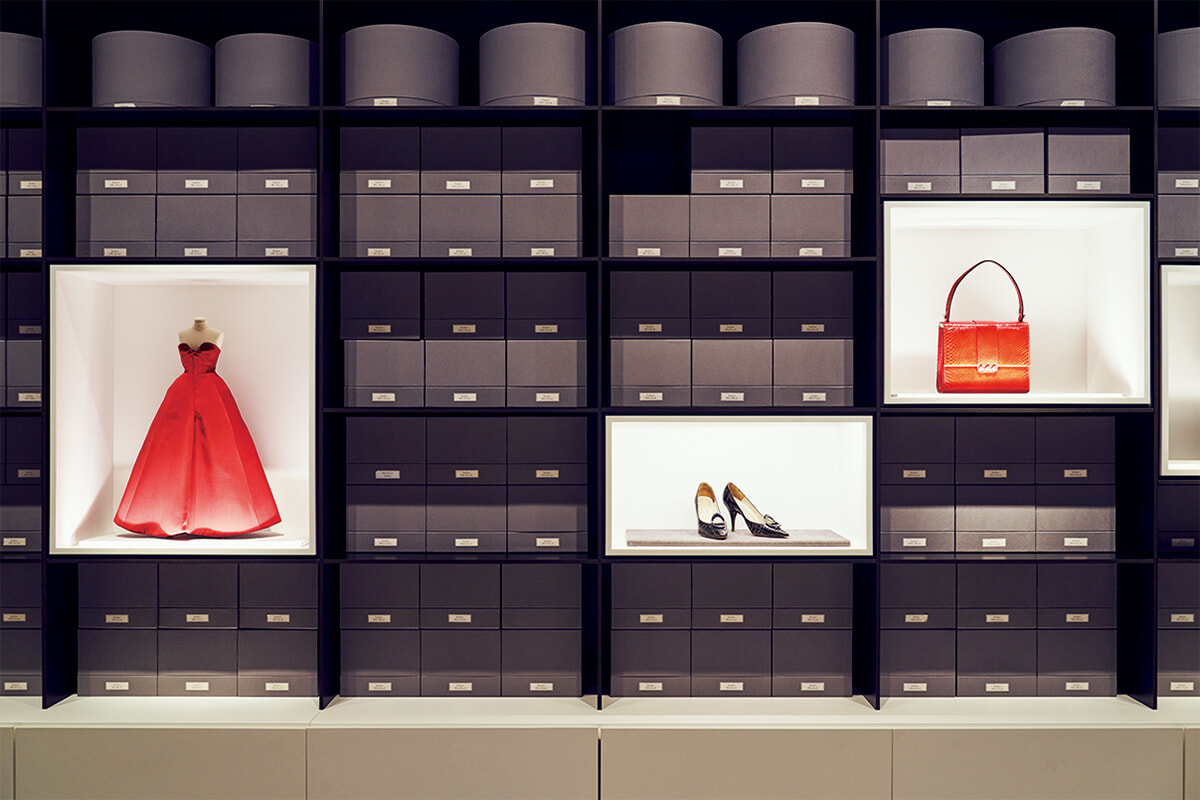 摂氏19度、湿度50%に保たれた保管庫。バッグ、靴、帽子、コスチュームジュエリーなどは1点ずつ、それぞれの形に合わせたオーダーメイドの箱に納められている。ドレスは、布カバーに納めてラックに吊るすか、箱に平置きに。どれも人の身体のようなパディングが施されて型崩れや布への負担を避け、取り出す時にもなるべく人の手が直接触れないようにと工夫が凝らされている。