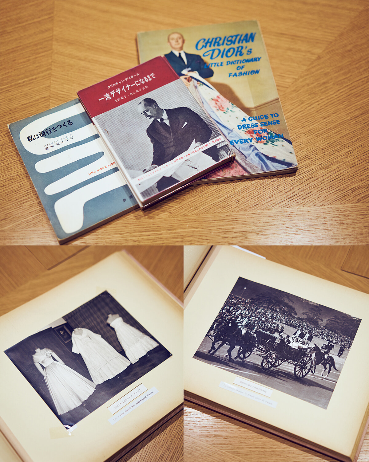 下の写真はクリスチャン・ディオールの3冊の著作。その下のアルバムは、1959年の上皇后美智子さまのご成婚時の写真。