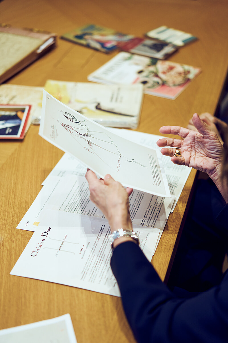 「ディオールにヘリテージ部門が誕生したのは87年のこと。メゾンの創業40周年を記念して、創業者クリスチャン・ディオール10年間のクリエイションを振り返る展覧会がパリで開催されたことがきっかけでした」とソアジックは語る。以来、顧客から過去のオートクチュール作品を買い戻し、96年からは毎シーズンすべてのオートクチュール作品を保存。靴やバッグ、帽子などの小物、デザイン画や写真、プレスリリースや招待状などのドキュメントまでも含む膨大なコレクションは、メゾンのクリエイティブ ディレクターはもちろん、デザインチームにとって大切なインスピレーション源となっている。