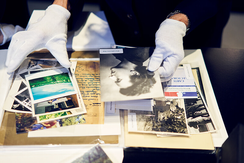 図書室で最初に見せられたのは、クリスチャン・ディオール本人が著した3冊の本だった。女性たちへのファッションアドバイスをアルファベット順に記した辞典『The Little Dictionary of Fashion』のユーモアいっぱいの文章に、「ムッシュはおもしろい人だったんですね」と綾瀬。迷信や占い好きでポケットに星やスズランなどいつもたくさんお守りを入れていたことなど、ムッシュを語る逸話が披露されてムッシュの人柄を身近に感じたところで、ソアジックが綾瀬を誘ったのは、香水の部屋だった。そこに用意されていたのは、グレーの箱に入ったディオール家の家族写真の数々。