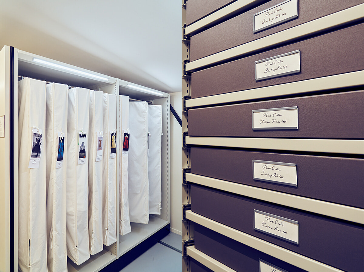 衣類と書類を保管する部屋は、摂氏19度、湿度50%に保たれている。ここに置かれているのは、膨大なヘリテージの所蔵品のごく一部にすぎない。重力に弱い繊細なドレスは、ケミカル素材を一切使用しないグレーの紙製ボックスに入れて平置きされている(右下)。服の形を保つために入れるシルクペーパーも非酸性。ラックには、白い布のカバーに入ったドレスが掛かっており、こちらは上半身が立体的なトルソー、腰回りにもパディングを入れて吊るして保管(左下)。