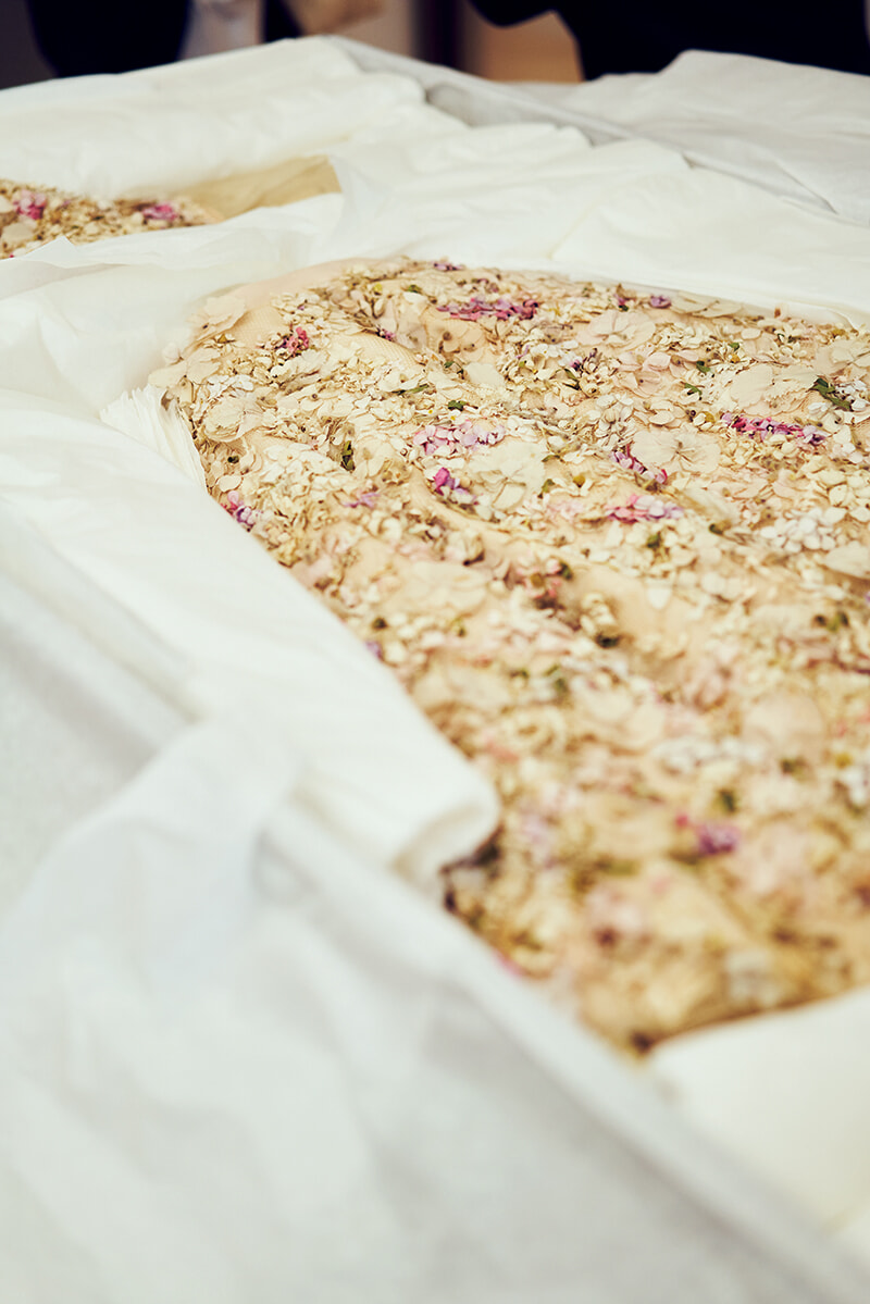 「ミス ディオールはドレスのラインの名前でもあるのですよ」と、ソアジックは大きなグレーの箱を開ける。箱の中には、人の身体を立体的に再構成したシルクペーパーを詰めて平置きされたドレスが眠っている。