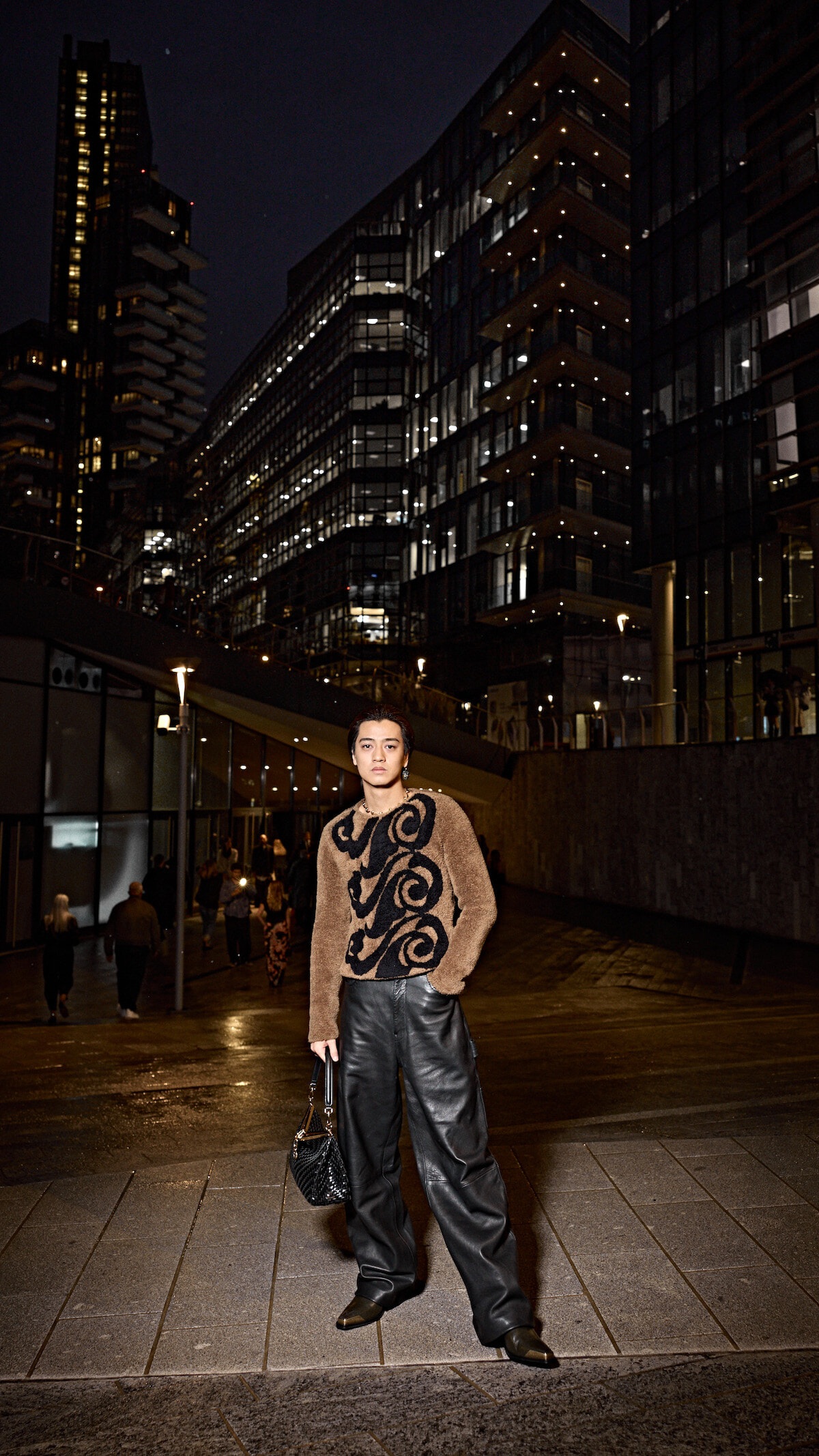 ミラノコレクションに初参加となる髙橋海人は、ブラウンとブラックのモダンなカラーパレットで構成されたエトロの最新ルックを纏い登場した。